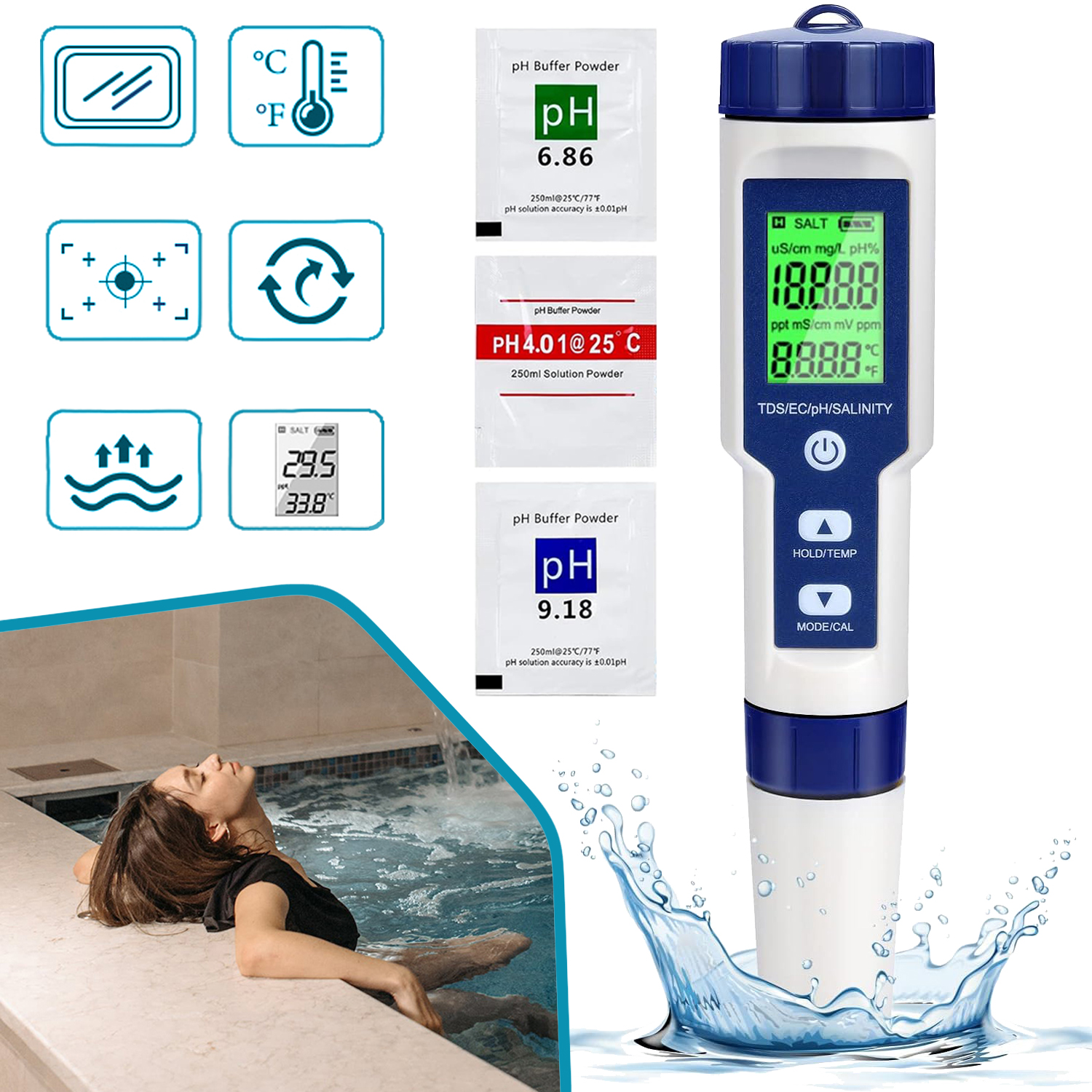👍👍👍 PH-метр 5 в 1: вимірювач якості води може одночасно вимірювати pH, TDS ( ppm), EC (провідність), солоність (ppt) і температура.