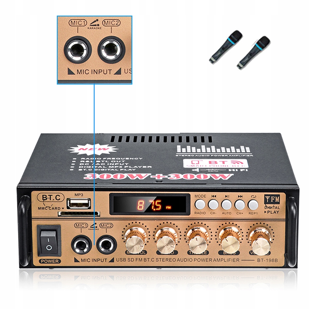 - Аудіовхід: Bluetooth/стерео RCA/U диск/SD-карта/FM-радіо/мікрофон 1 і 2