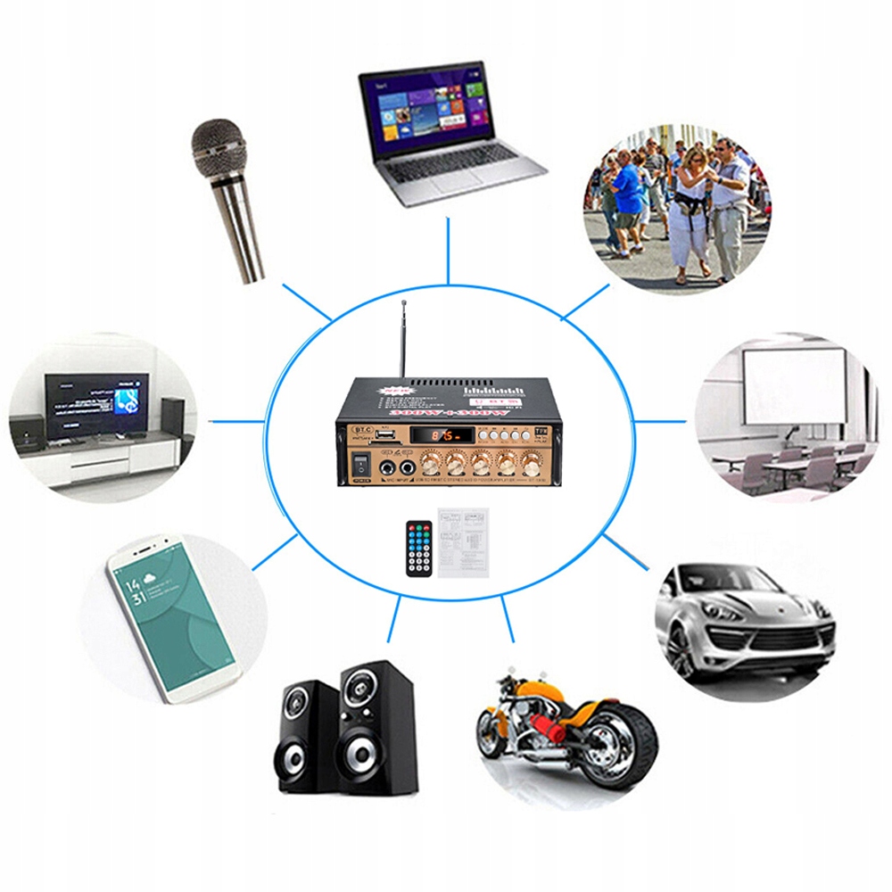 - Бездротовий Bluetooth, SD-карта, USB-накопичувач, RCA стерео, FM-радіо та 2 комплекти мікрофонів, сумісні з більшістю аудіопристроїв, таких як iPhone, смартфони, планшети, комп’ютери, тощо.