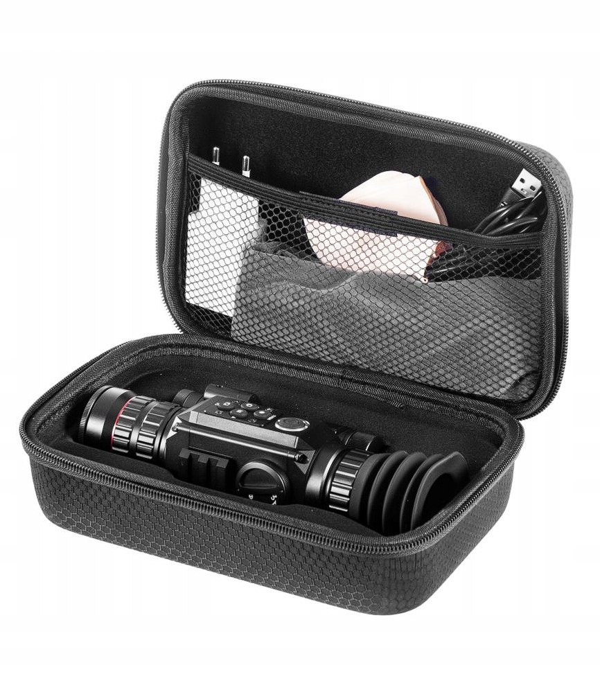 - Дальність до 200 м, роздільна здатність 1024 × 768 пікселів, живлення від батареї 18650. У набір входять, серед іншого: кришка об’єктива, акумулятор, USB-кабелі та зарядний пристрій, а також футляр.