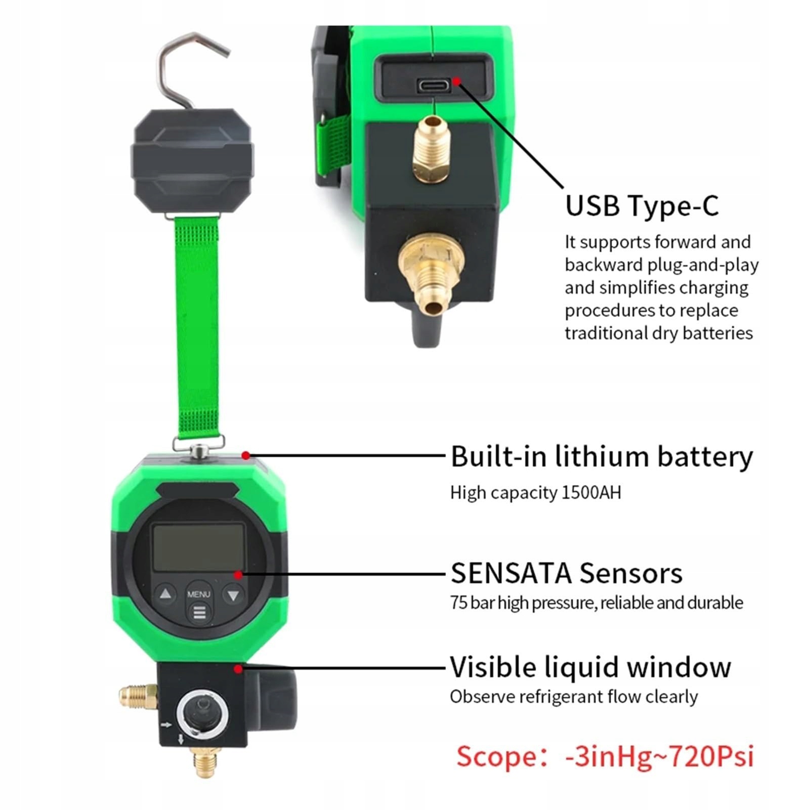 2. Комплексний моніторинг параметрів: Цей цифровий промисловий вакуумний індикатор не тільки відображає тиск у системі, але й надає важливі дані, такі як відповідна температура випаровування для різних холодоагентів. Ця функціональність дозволяє методикам легко та точно оцінювати продуктивність системи під час встановлення та технічного обслуговування.