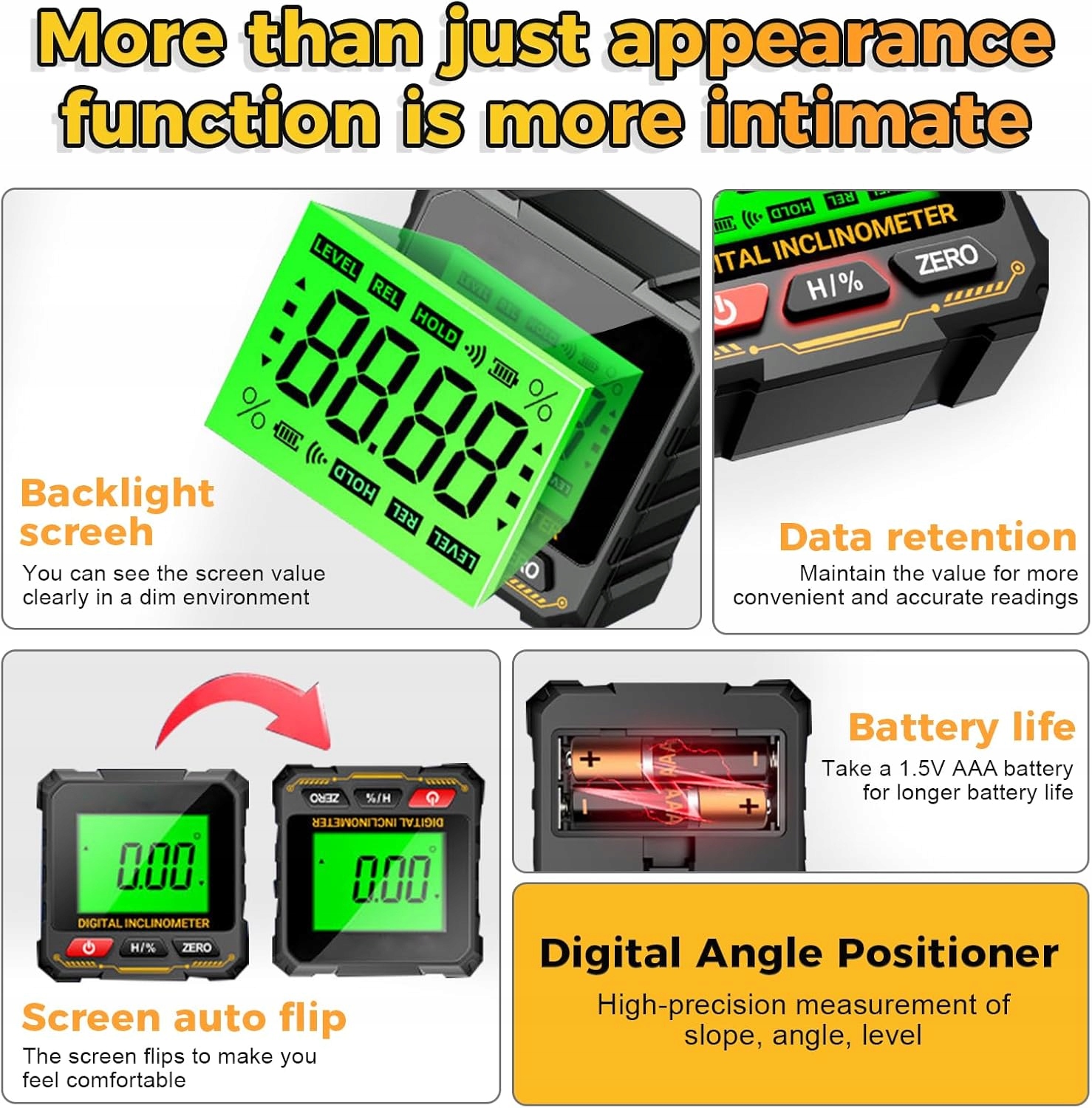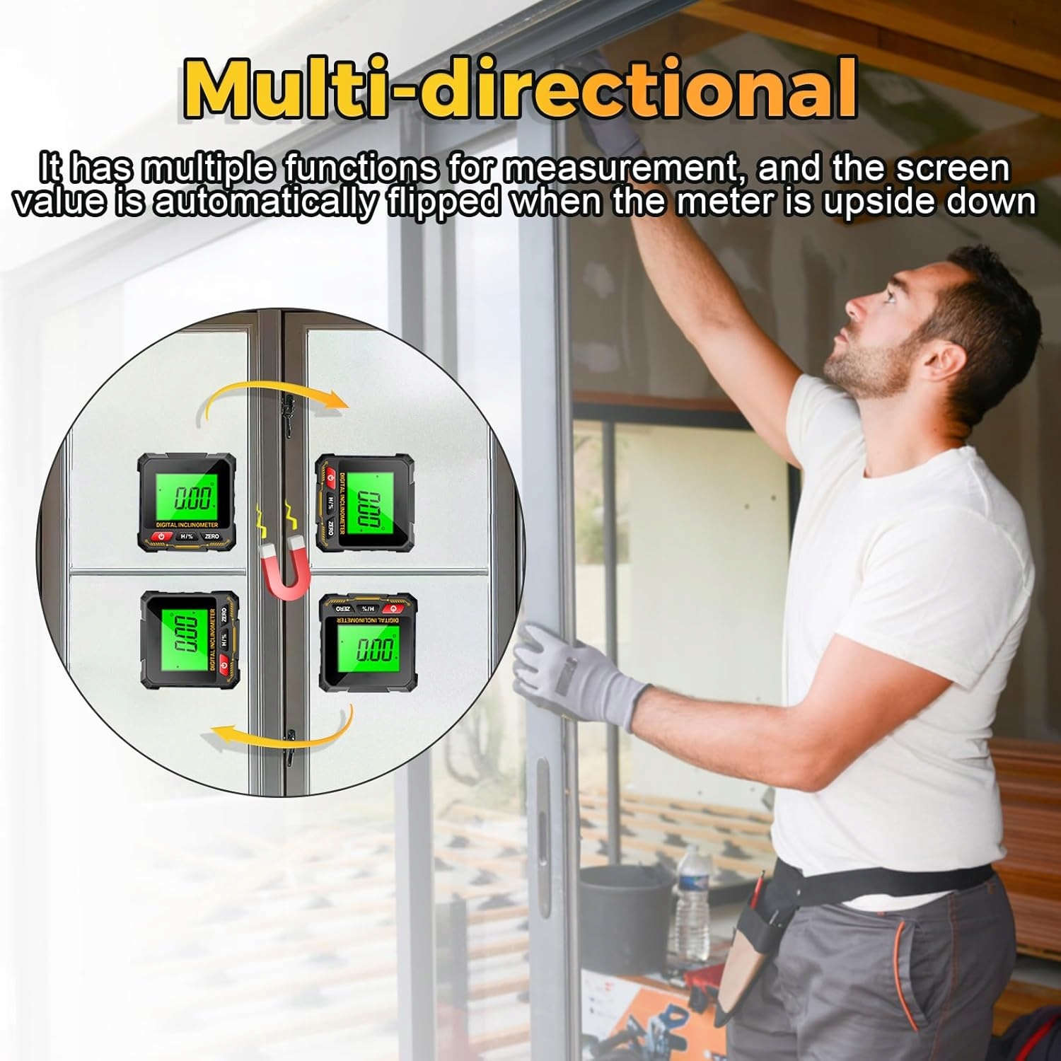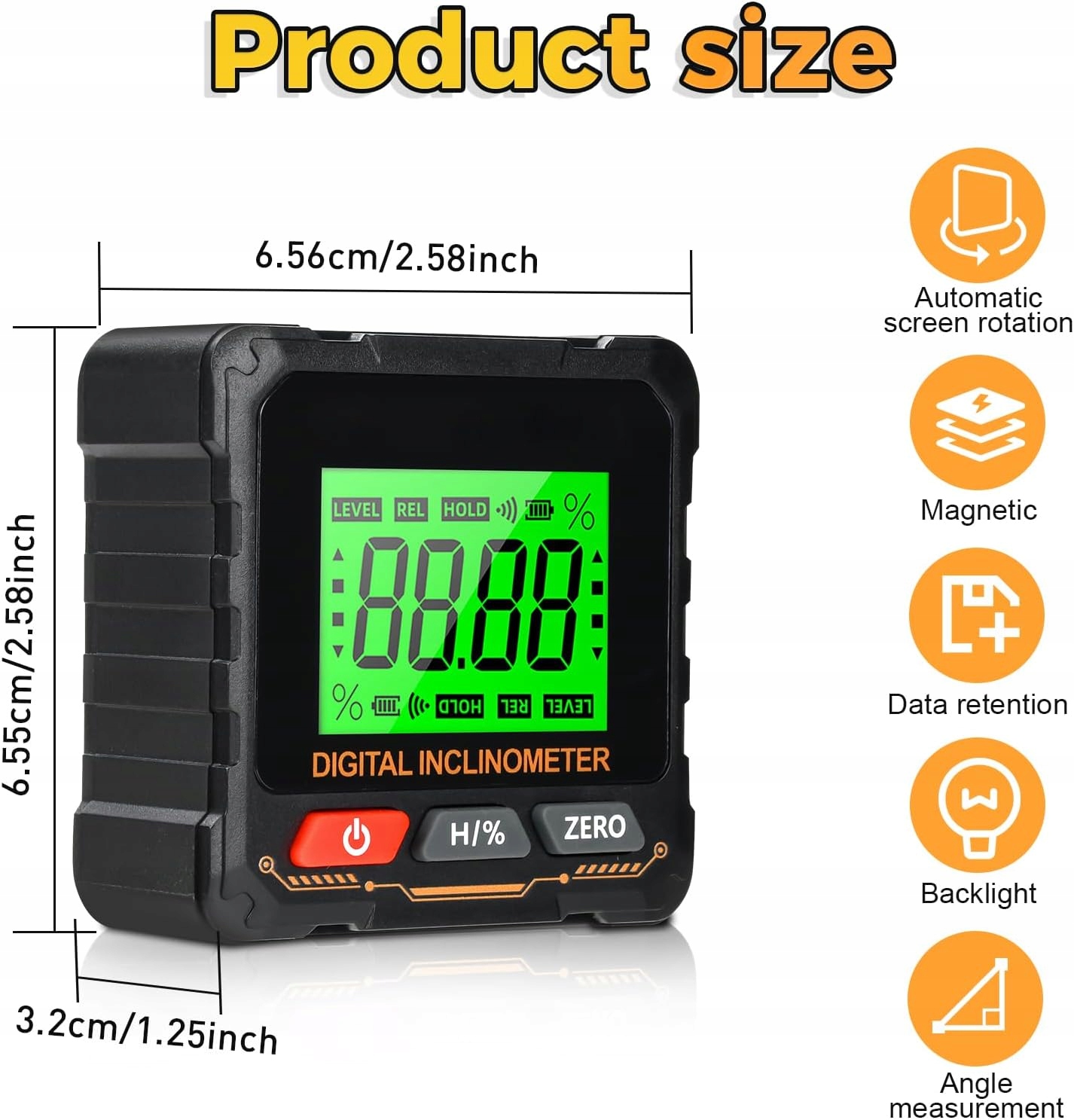 Транспортир автоматично повертає екран, дозволяючи вимірювати по горизонталі, вертикалі та нахилу. Ідеально підходить для технічної роботи та домашніх проектів DIY.