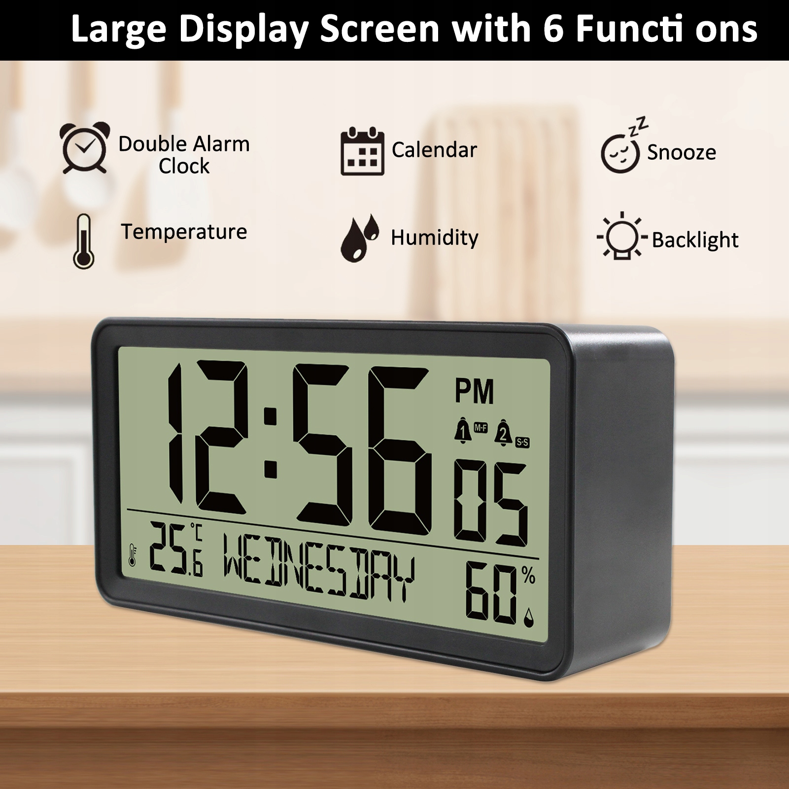 Великий дисплей: цифровий будильник з РК -дисплеєм, чіткі числа, дисплей температури (° C або ° F), календар. Кожна функція має окрему кнопку, просту у використанні для дітей, людей похилого віку, прості для читання та встановлення.