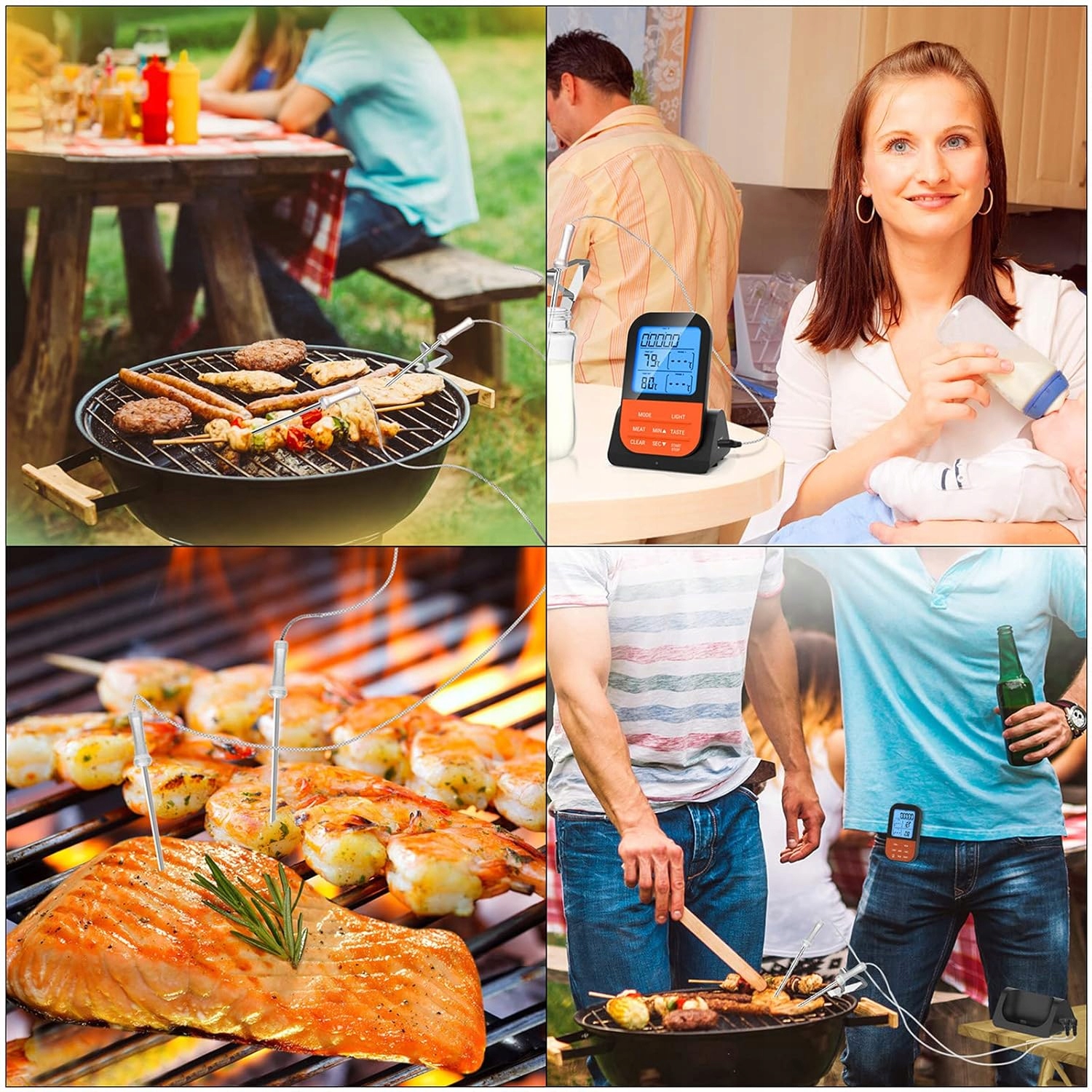 ➡ обмеження бездротової температури - повна свобода! 'Не треба бути на духовці або на грилі - відображена температура в режимі реального часу . Ви можете мати доступ до інших обов'язків вдома або в саду. і дозволяє адаптувати температуру до яловичини, курки, риби, індички, свинини та інших м'яса . Ви також можете вибрати 5 типів смаження - від кривавих до добре запечених! Не потрібно здогадуватися, чи готовий ваш пристрій - 2 датчики температури, що контролюють два одночасно або вимірювання температури всередині пристрою або гриля. 4 екран забезпечує легке читання навіть вночі . Ви можете вибрати ° C або ° F . Час миття або цільова температура - Коли їжа досягає ідеального рівня, термометр випромінює звуковий сигнал та спалах . Експлуатація та зручне кріплення