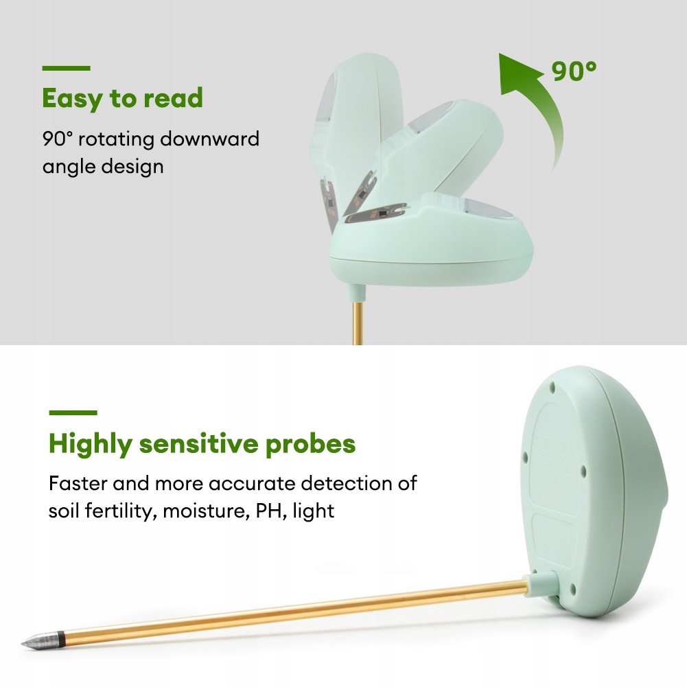 - Багатофункціональний дизайн 4-в-1, є 4 режими вимірювання, які можна змінювати, ви можете легко перемикатися між світлом, вологістю, поживними речовинами та pH.