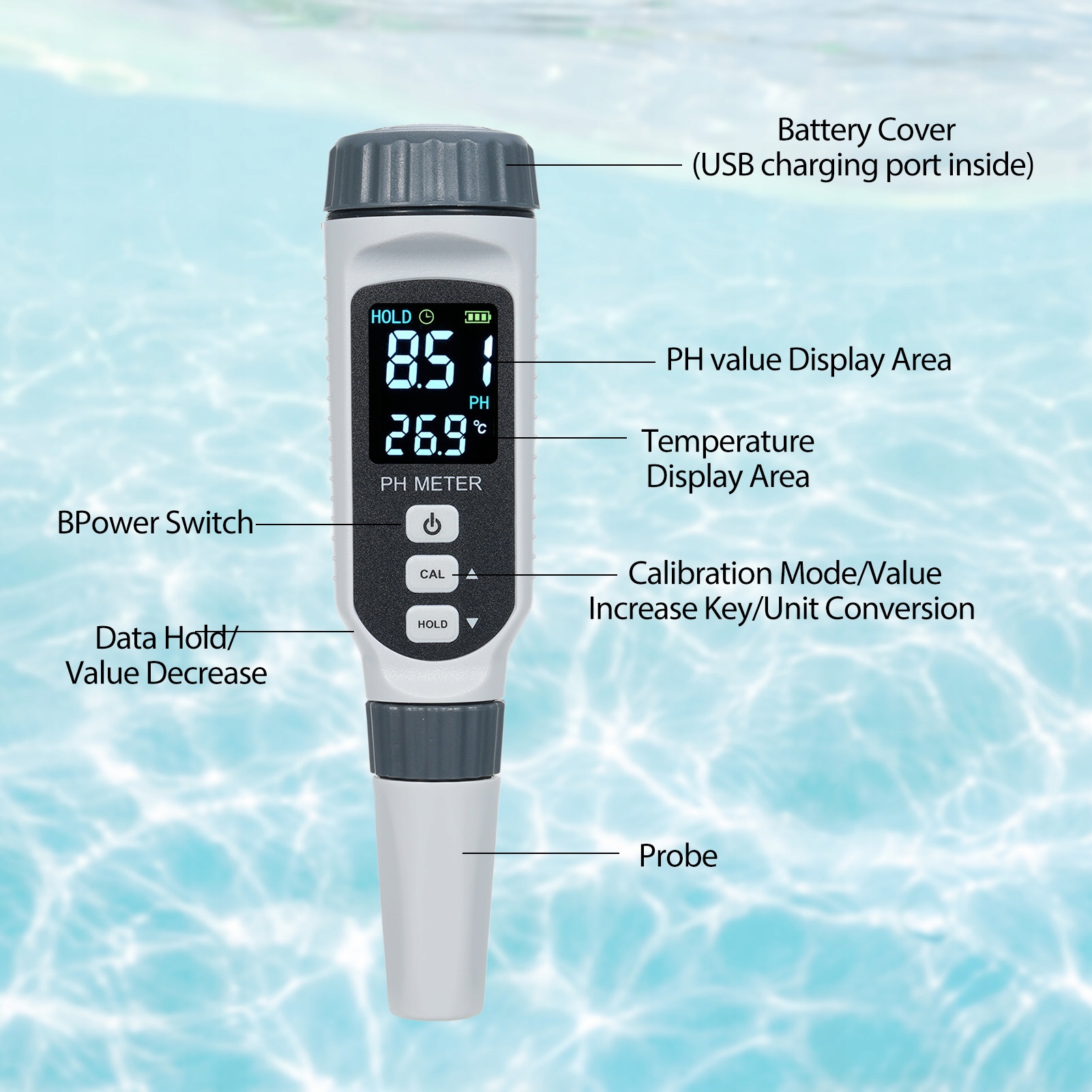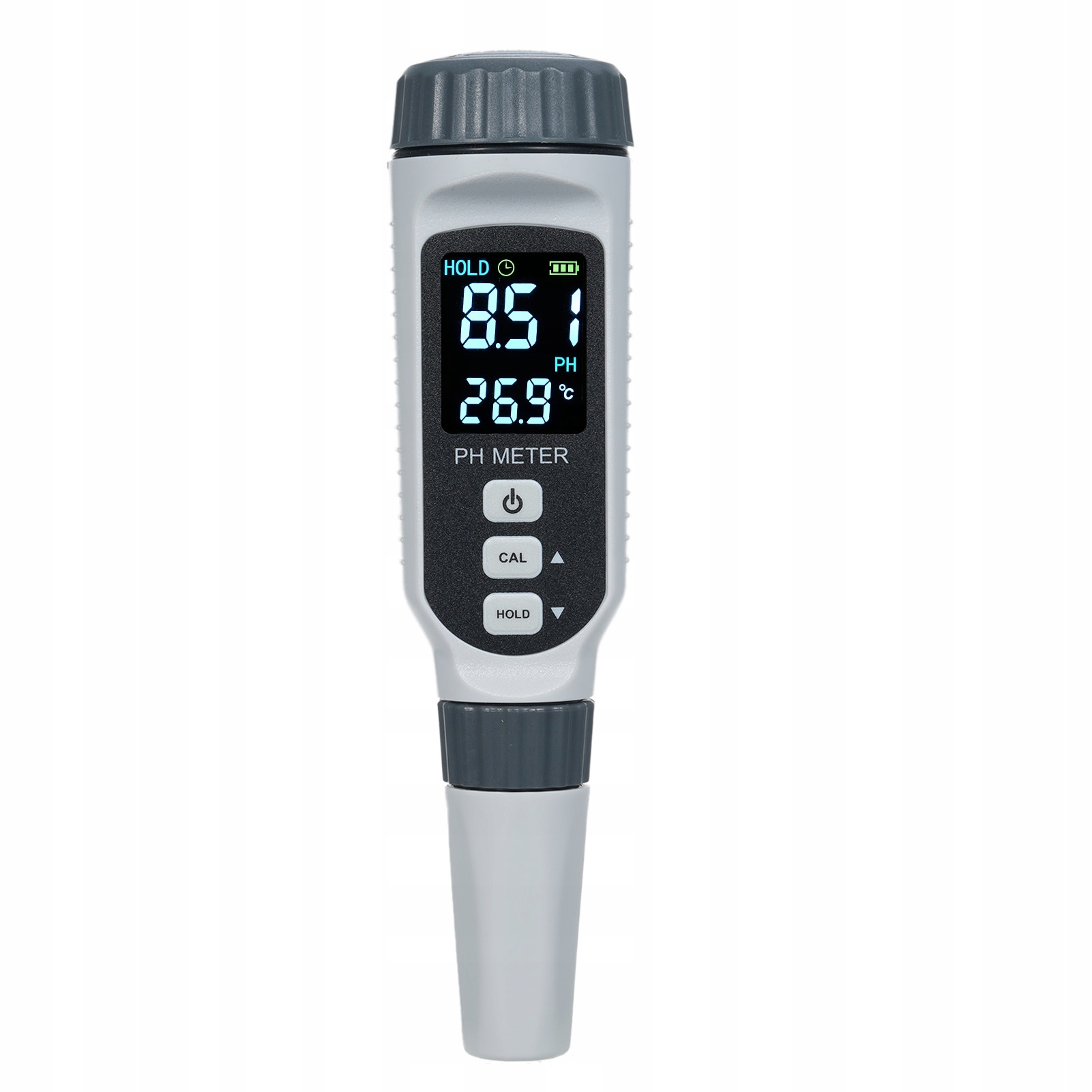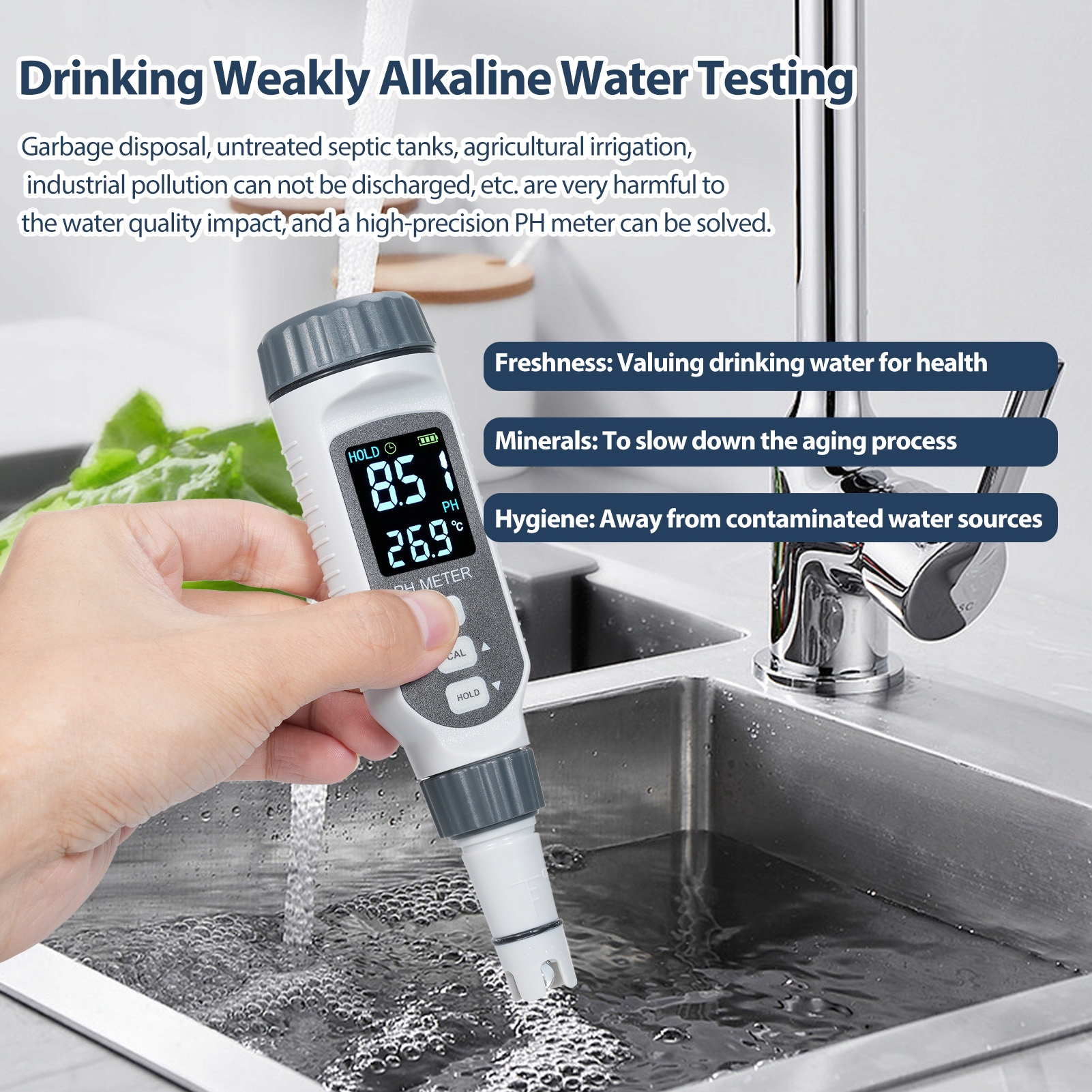 - Ви хочете знати, чи залежить значення pH води, яку ви п'єте, від стандарту? Якщо так, то цей pH-метр – те, що вам потрібно. Оснащений автоматичною температурною компенсацією, яка автоматично компенсує температуру розчину 0~70℃, може забезпечити точні та стабільні зчитування.