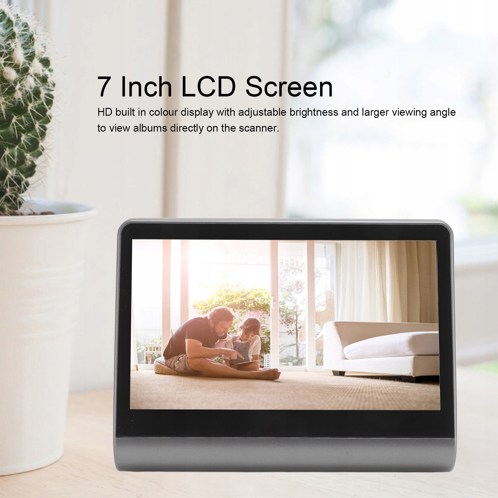 1. 7-дюймовий РК-екран: Цей цифровий сканер плівки оснащений 7-дюймовим РК-екраном із вбудованим кольоровим дисплеєм HD, з регульованою яскравістю та більшим кутом перегляду, що дозволяє переглядати альбоми безпосередньо на сканері.