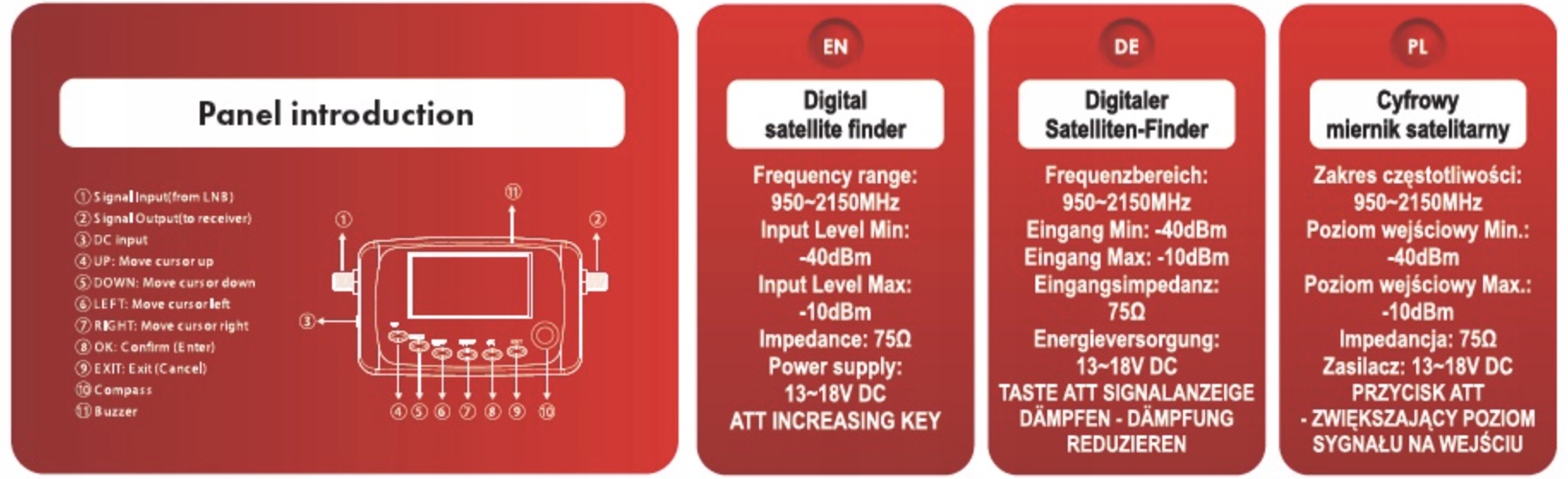 Ці вимірювання є лише відсотками, як у тюнерах. Пошук супутникового сигналу позначається графічним індикатором на дисплеї та звуковим сигналом.