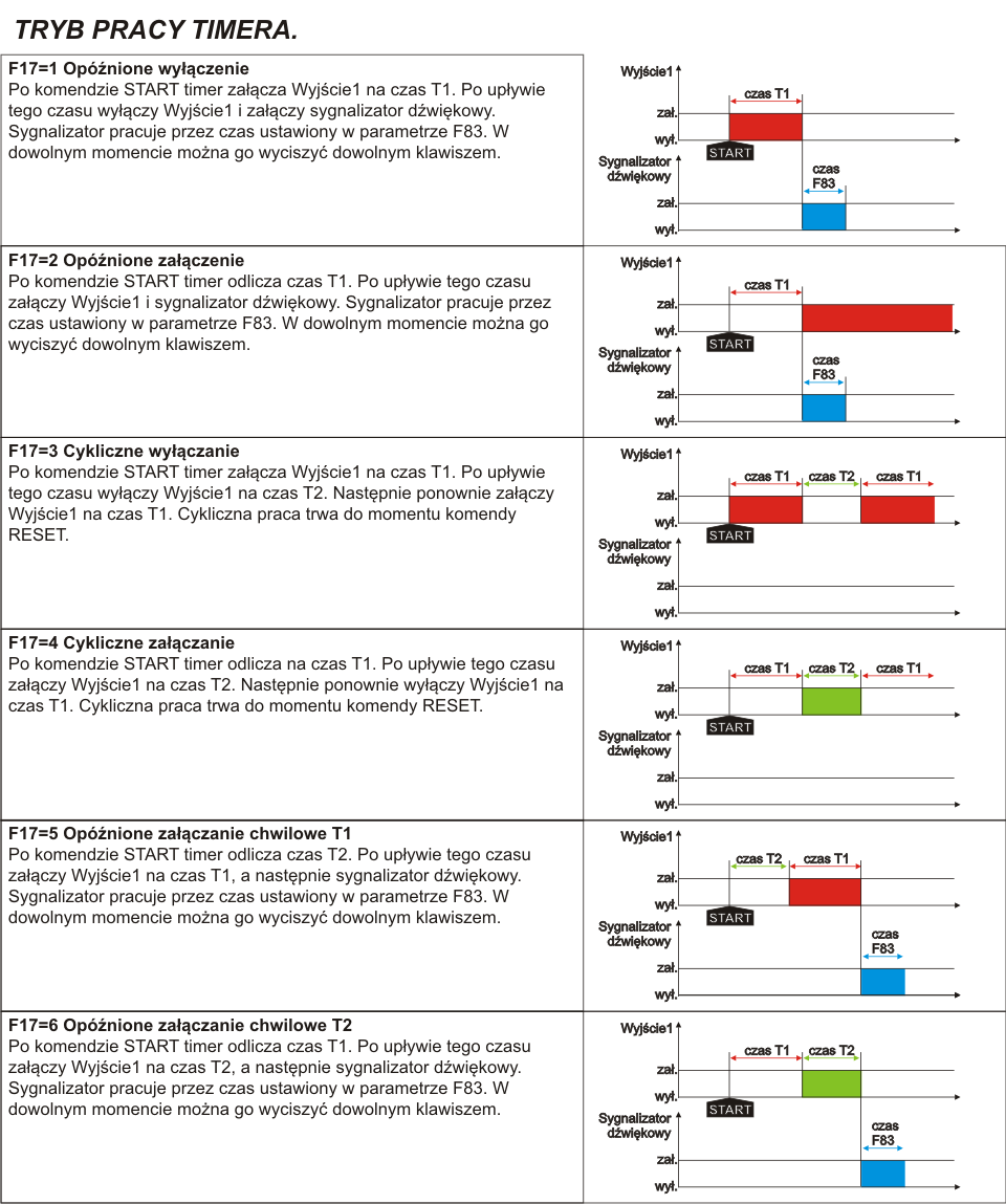 Таймер використовується для вмикання/вимкнення пристроїв або як лічильник часу роботи. Він може працювати з установкою часу лише T1 або T1 і T2 у циклічній роботі. Має 6 режимів роботи, які запускаються кнопками START/STOP, RESET або зовнішнім сигналом короткого замикання. Працює зі звичайними двополюсними вимикачами (бістабільні) або імпульсними вимикачами дзвінка (моностабільні).