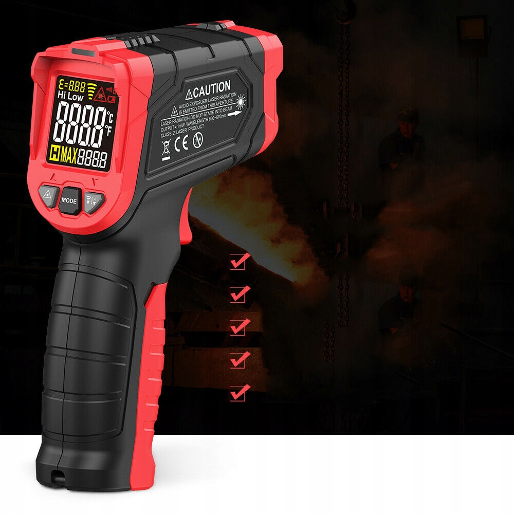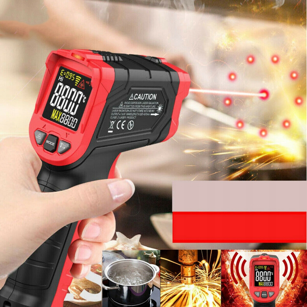 🌡️ 【Універсальний дизайн】 Автоматичне попередження, коли виміряна температура перевищує налаштування нижньої/вищої межі. Діапазон коефіцієнта випромінювання від 0,1 до 1,0. Ви можете встановити коефіцієнт випромінювання залежно від матеріалу. РК-екран з підсвічуванням і індикатором низького заряду батареї; функція автоматичного вимкнення живлення, вимикається через 30 секунд без жодної операції.