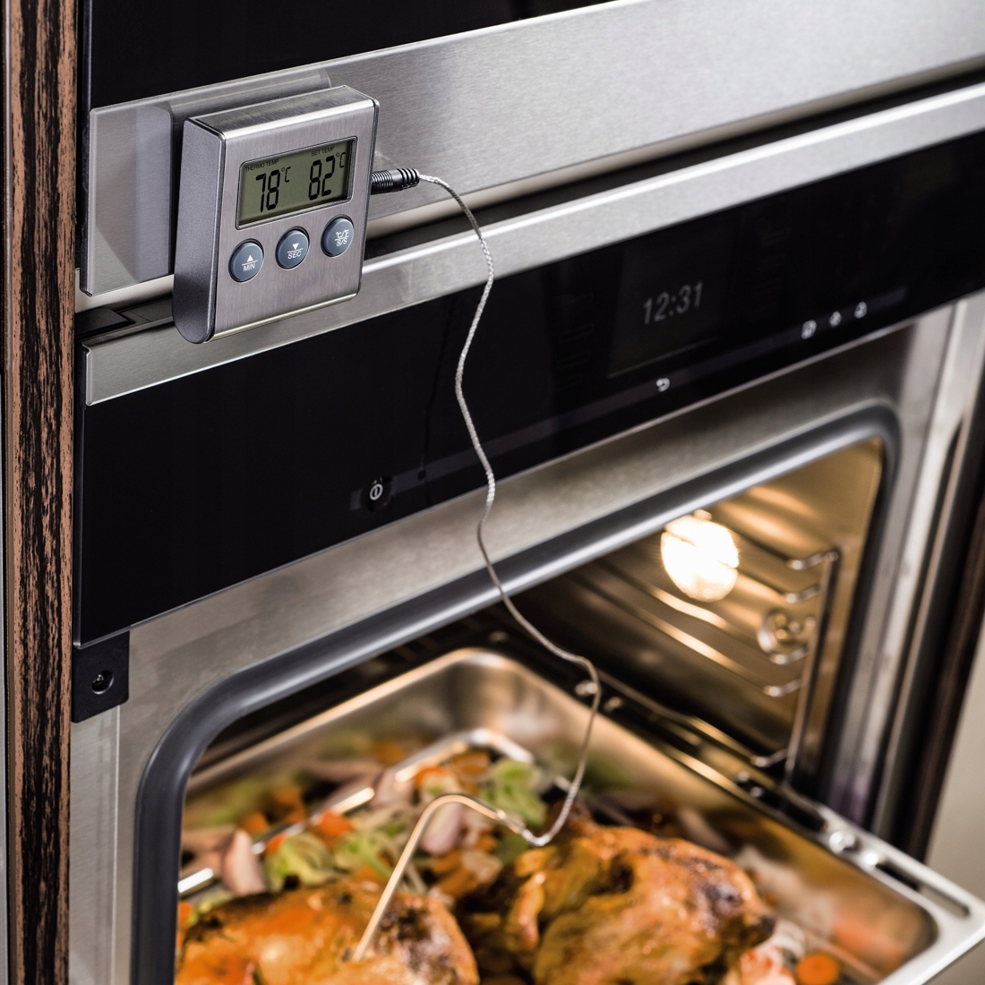 Датчик із нержавіючої сталі вимірює температуру готової їжі з точністю до 1°. Завдяки цьому ви точно знаєте, при якій температурі готується страва.