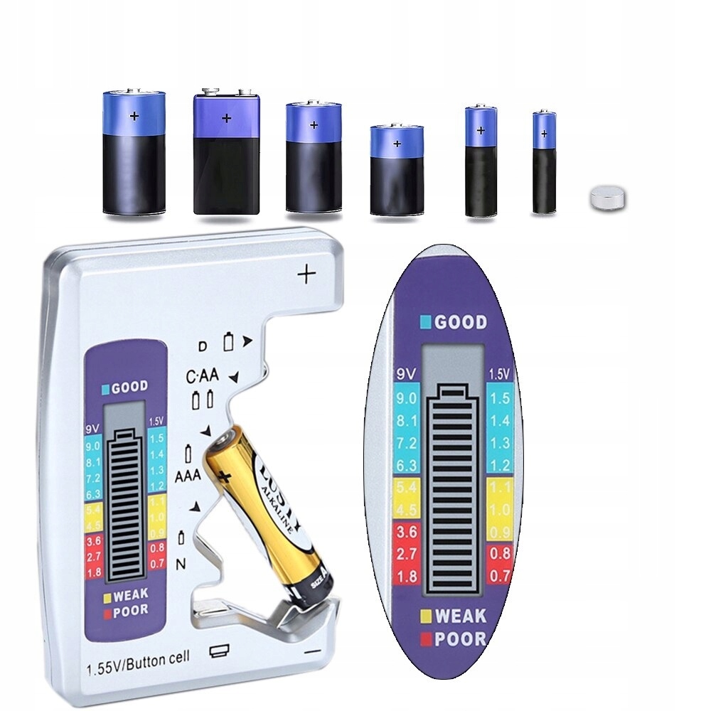 - Діапазон тестування: C, AA, AAA, D, N, 9 В 6F22 і кнопковий елемент 1,55 В