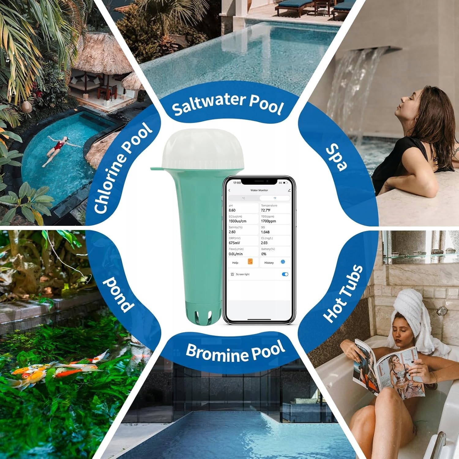 Цифровий тестер басейну RYAKKA для вимірювання хлору, рН, фізіологічного розчину, температури, ОВП, EC, TDS, 7 в 1, швидкий вимірювач, Wi-Fi тестер води з додатком, автоматичне повідомлення, аналізатор води для гідромасажних ванн і спа