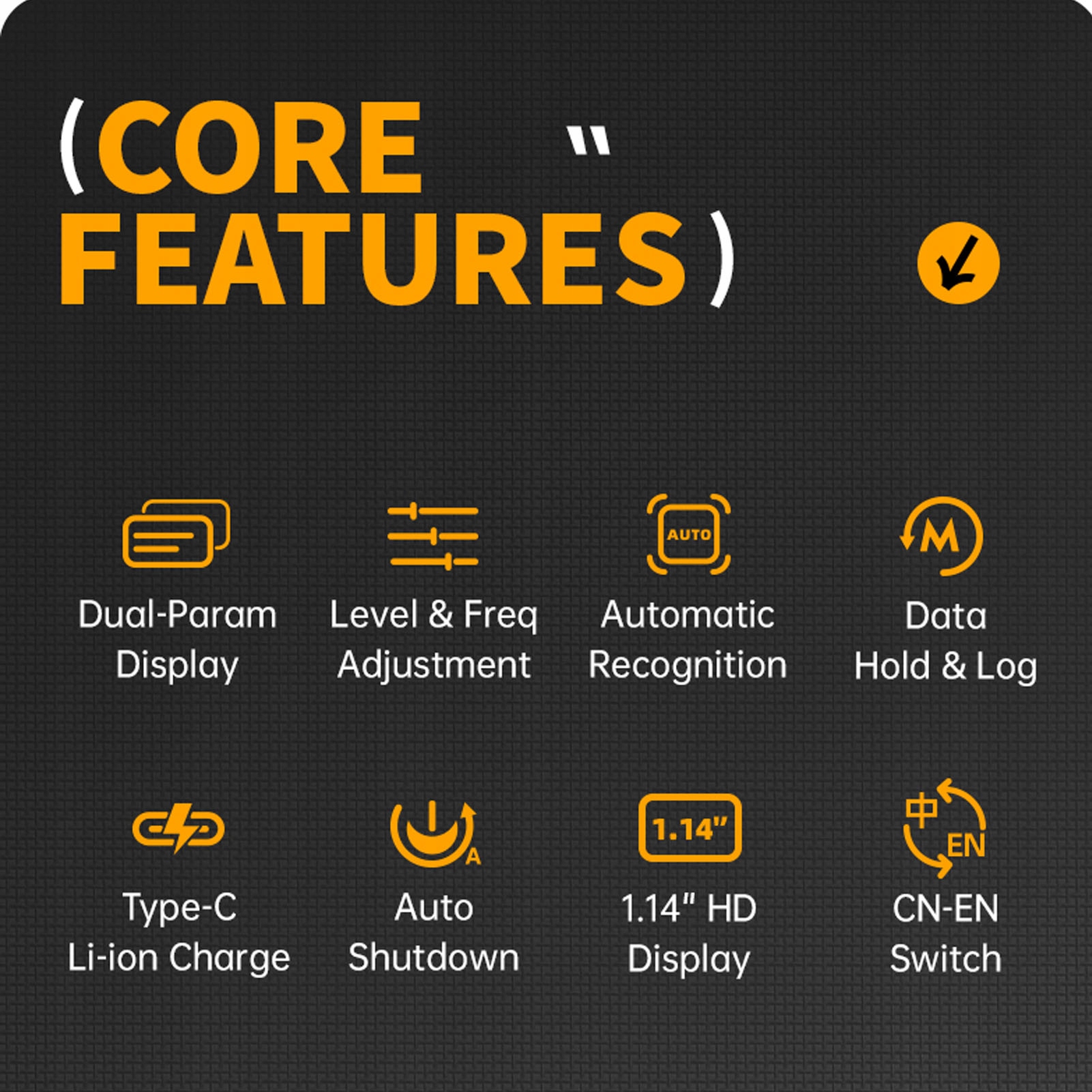 5. 1,14 -дюймовий кольоровий дисплей: Digital Tester SMD з кольоровим дисплеєм з діагональною 1,14 дюйма забезпечує додаткову зручність завдяки магнітній всмоктувальній функції на кінчиках, побудованому -в акумуляторі для сміття 250 мА, що забезпечує щоденне використання та ковзання трьох режимів частоти 100 Гц, 1 кГц та 10 кГц.