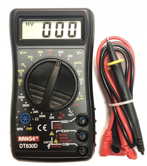 DT830D — простий кишеньковий цифровий лічильник від RANGE. DT830D — це цифровий мультиметр з РК-дисплеєм для виконання основних електричних вимірювань у вашому домі чи автомобілі. Завдяки низькій ціні і невеликим розмірам ідеально підходить як лічильник для автомобіля, сумки і т. д. Дозволяє виконувати найпоширеніші вимірювання, тобто вимірювання напруги, перевірку переходу акустичним тестером прохідності, вимірювання опору, тобто електричний опір резисторів, нагрівачів тощо.