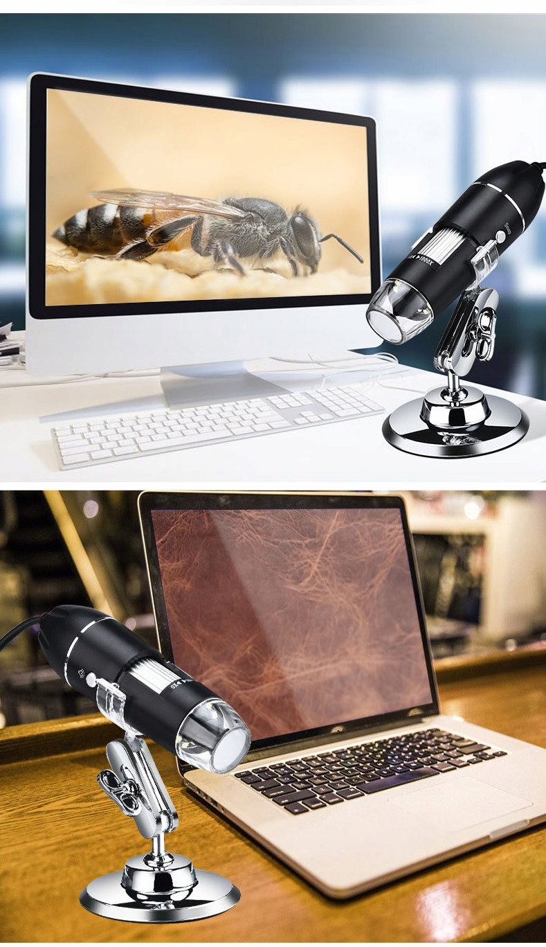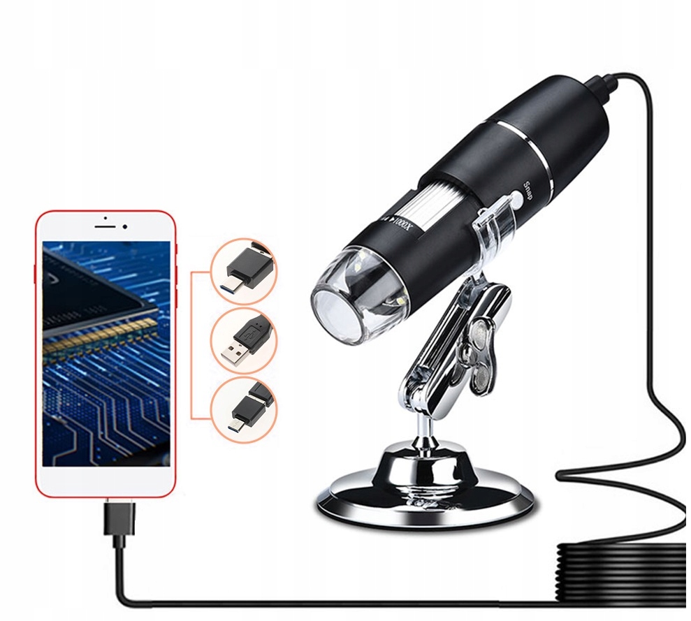 Цифровий USB-мікроскоп зі світлодіодним підсвічуванням дозволяє відображати переглянуте зображення на екрані телефону або комп'ютеру високої якості. Працює як камера - зображення передається в прямому ефірі - в реальному часі - забезпечує безперервний попередній перегляд поля спостереження та можливість запису фотографій або відео. Він оснащений світлочутливою матрицею з роздільною здатністю 2 мегапікселі.