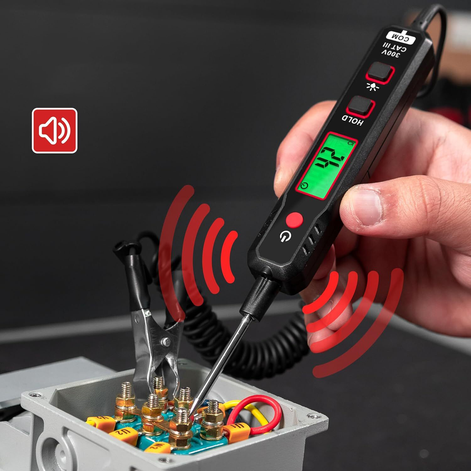 - Завдяки широкому діапазону виявлення від 0,8 В до 100 В постійного струму, зонд підходить для різноманітних тестів ланцюгів автомобіля, таких як перевірка запобіжників, кабелів, акумуляторів та Системи ACC, що полегшує виявлення несправностей у вашому автомобілі.