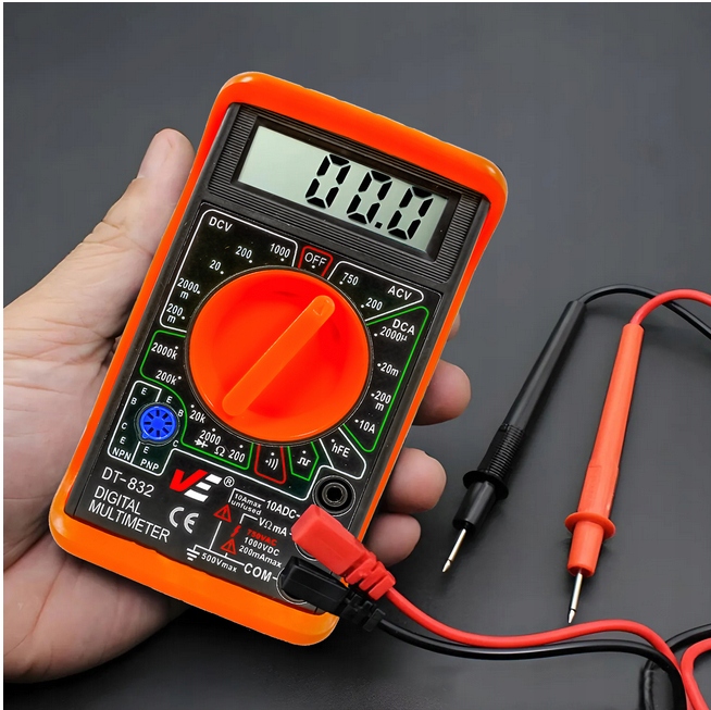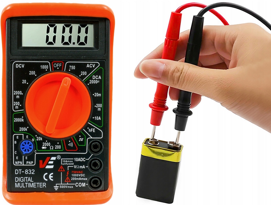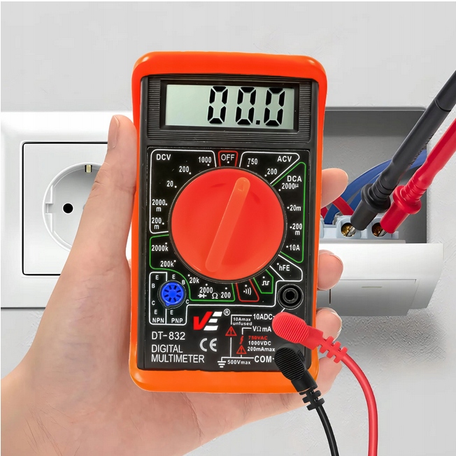 Цифровий мультиметр Verke DT832 розроблено відповідно до стандарту EN61010 і характеризується категорією вимірювання CAT I (перенапруга) і другим класом захисту. Цей прилад виконує вимірювання постійної та змінної напруги, постійного струму, опору, безперервності (акустичний сигнал), перевірку діода та h FE (підсилення постійного струму в колі транзистора WE). Лічильник генерує тестовий сигнал синусоїди або прямокутника з частотою 50 Гц і рівнем 5 В p-p