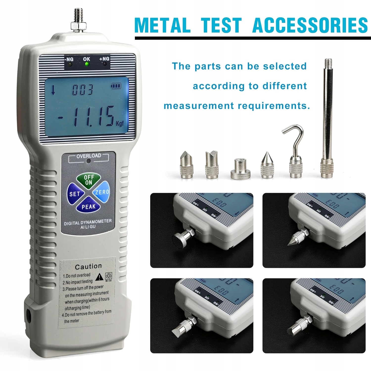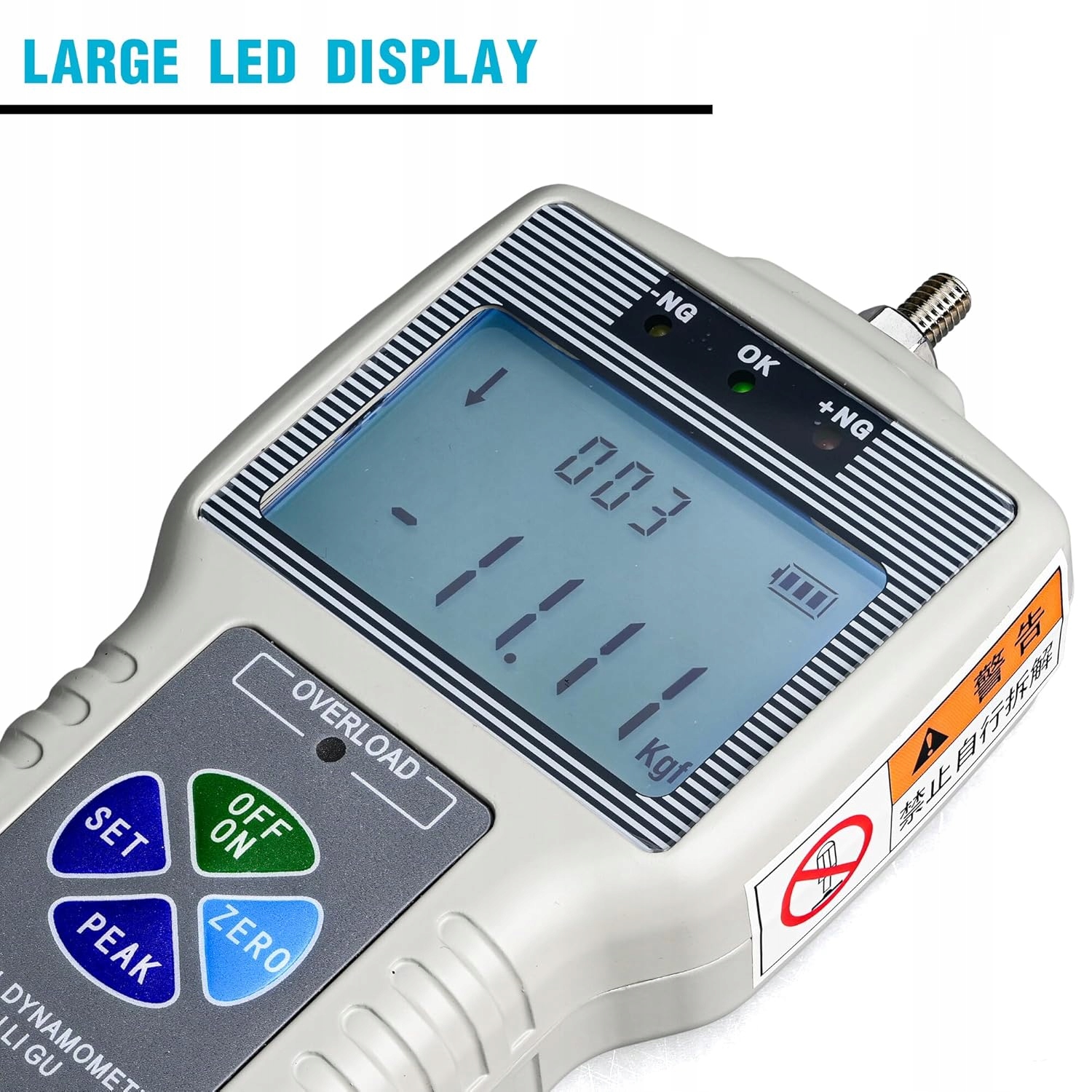 - Цифровий вимірювач сили, оснащений РК-екраном з підсвічуванням і міцним металевим корпусом. На задній панелі є отвори M4, які дають змогу встановити на вимірювальну підставку (не входить у комплект).