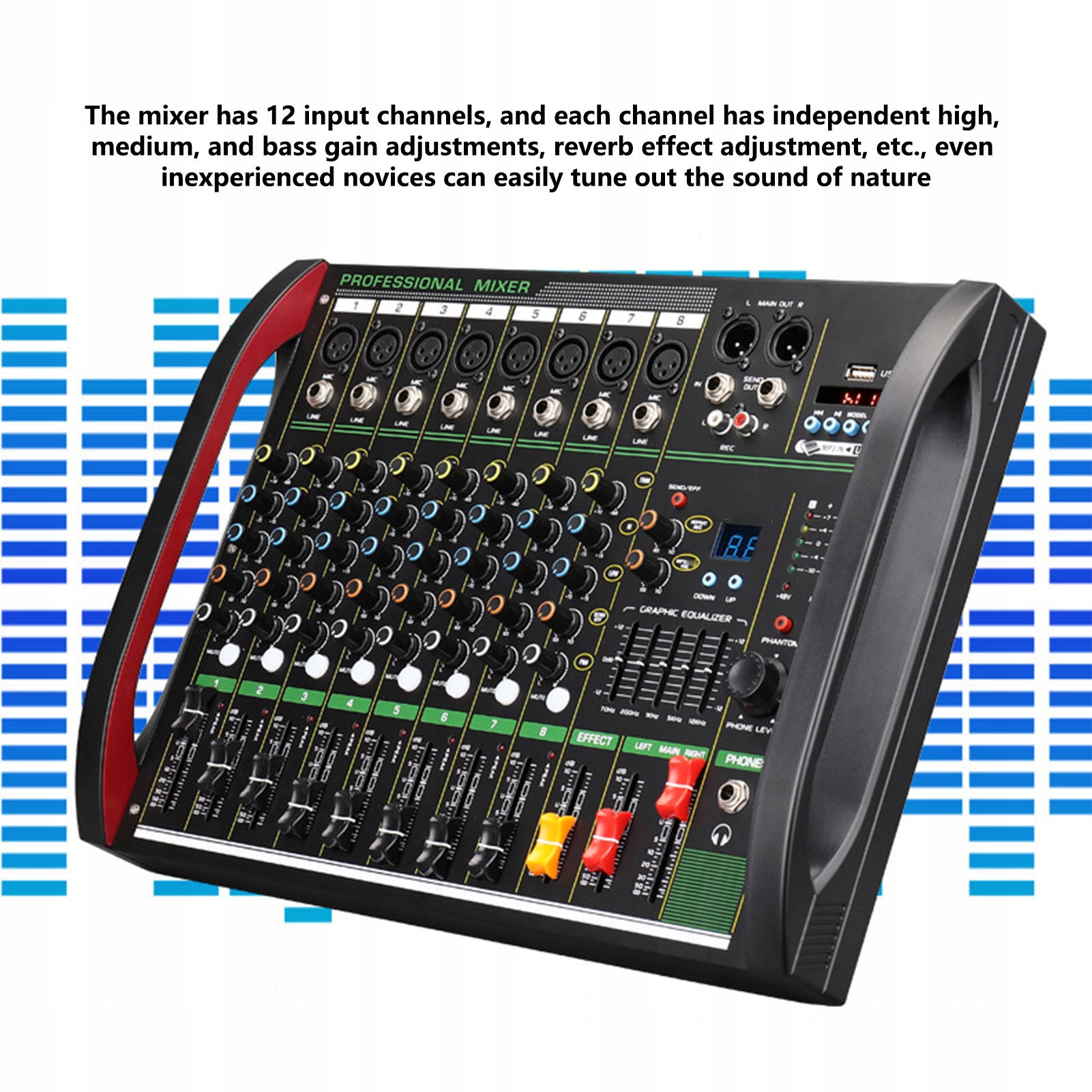 1. Широкі можливості підключення: мікшер має широкий спектр вхідних і вихідних інтерфейсів, що дозволяє підключати його до різноманітних пристроїв, включаючи дротові або бездротові мікрофони, електронні клавіатури, комп’ютери та колонки. Він також підтримує відтворення аудіо без втрат із USB-пристроїв, надаючи швидкий доступ до улюбленої музики. 2. Мікросхема DSP: створена з високоякісного металевого матеріалу материнської плати та незалежно розробленого чіпа звукових ефектів DSP, цей мікшер ефективно вирішує такі проблеми, як низька гучність і шум, забезпечуючи чудову якість звуку. 3. Зручне керування: завдяки 8 вхідним каналам, кожен з яких має незалежні регулятори посилення низьких, середніх і високих частот, а також налаштування ефектів реверберації, навіть недосвідчені початківці можуть легко досягти відмінної якості звуку. 4. Швидка передача Bluetooth: Завдяки високошвидкісній передачі Bluetooth цей мікшер підтримує більшість цифрових продуктів із функцією Bluetooth на ринку. Просто натисніть кнопку REP, щоб увійти в режим Bluetooth, знайдіть назву мікшера в налаштуваннях Bluetooth вашого пристрою та миттєво підключіться. 5. Різноманітність застосувань: цей звуковий мікшер підходить для різних випадків, таких як весілля, сценічні виступи, прямі трансляції та домашнє караоке в кімнатах KTV. Це дозволяє досягти більш збалансованих і ефективних результатів.