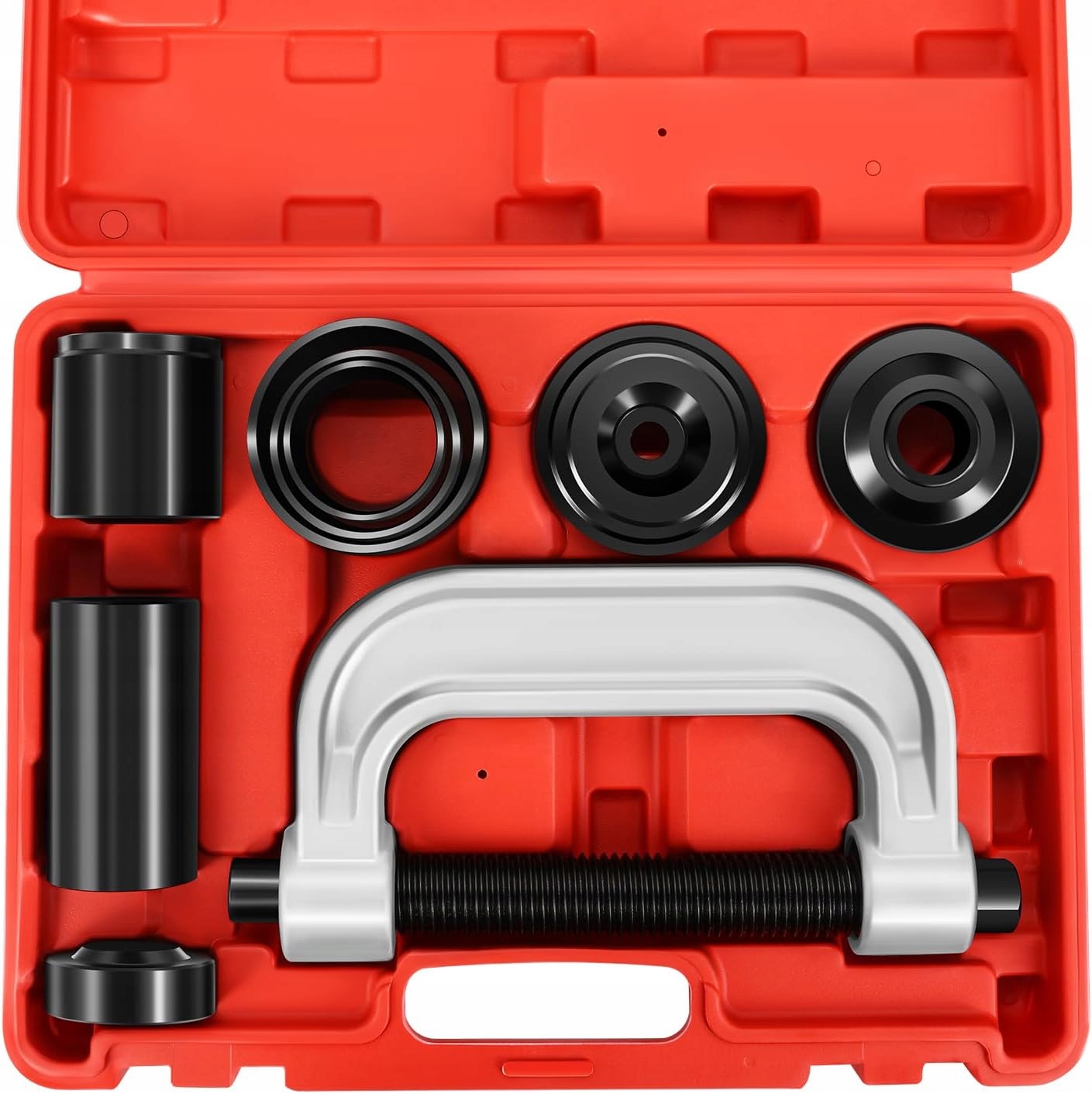 Пристрій, призначений для монтажу та демонтажу пресованих елементів, таких як кульові шарніри, пальці гальмівних колодок тощо. Інструменти виготовлені з лиття залізо та загартована вуглецева сталь Весь набір упакований у міцний пластиковий кейс.