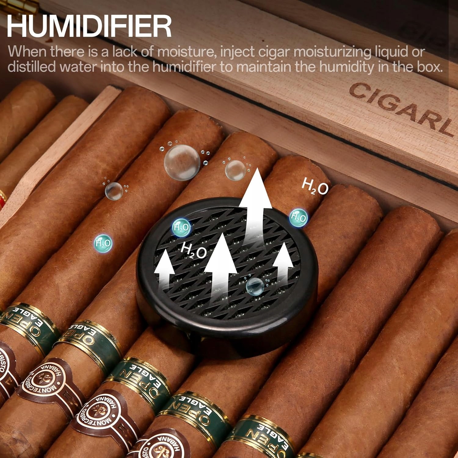 Вбудований зволожувач: вбудований зволожувач х’юмідора підтримує ідеальний рівень відносної вологості від 65% до 75%. Гігрометр х'юмідора дозволяє постійно контролювати вологість. Зволожувач повітря допомагає контролювати відносну вологість у вашому хьюмідорі, забезпечуючи достатню вологість для оптимального смаку та терміну зберігання ваших сигар. Він також має знімний відсік із кедрового дерева, що спрощує організацію вашої колекції.