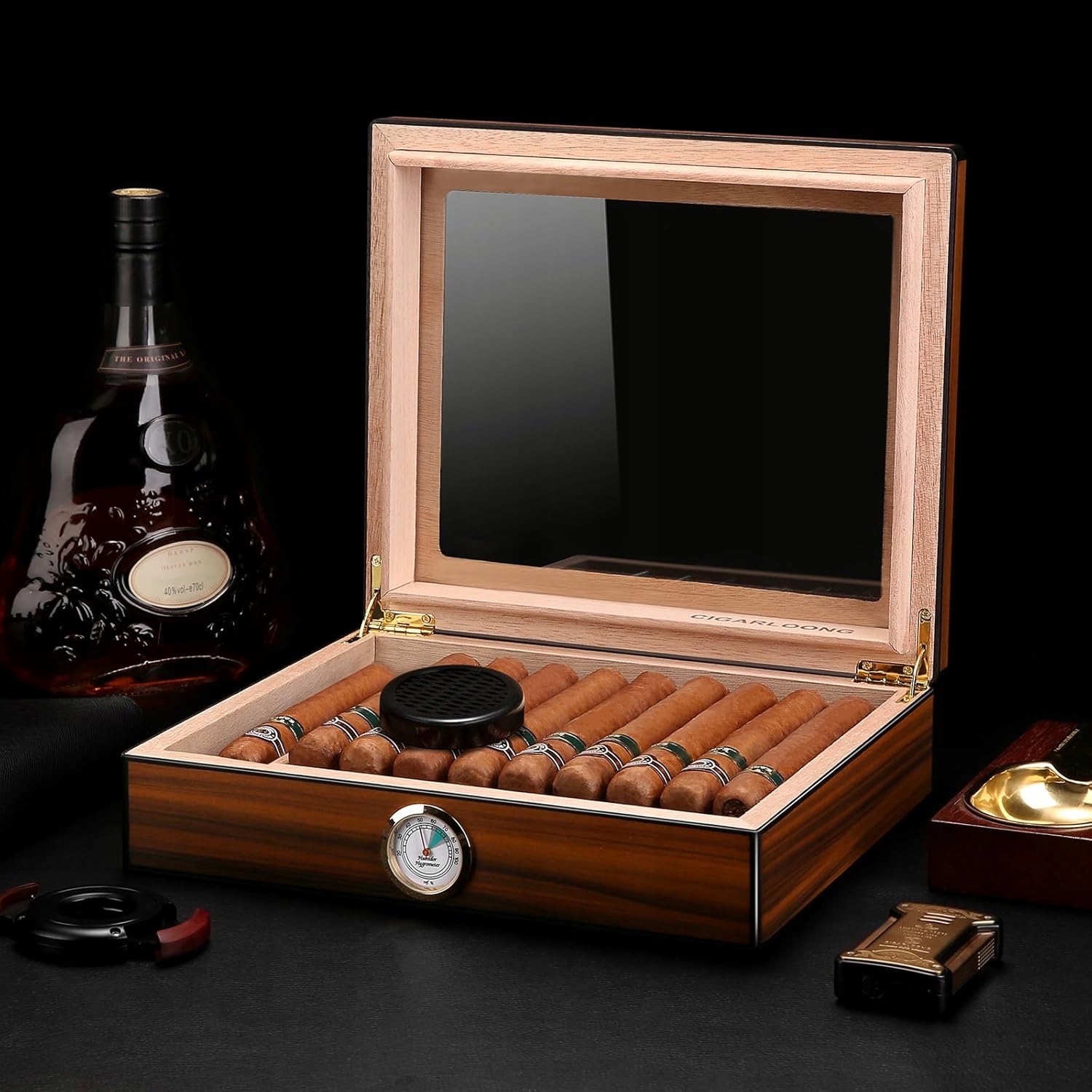 Сигарний х'юмідор CIGARLOONG, коричневий, 20-25, настільна сигарниця з кедровою підкладкою, з гігрометром і зволожувачем повітря