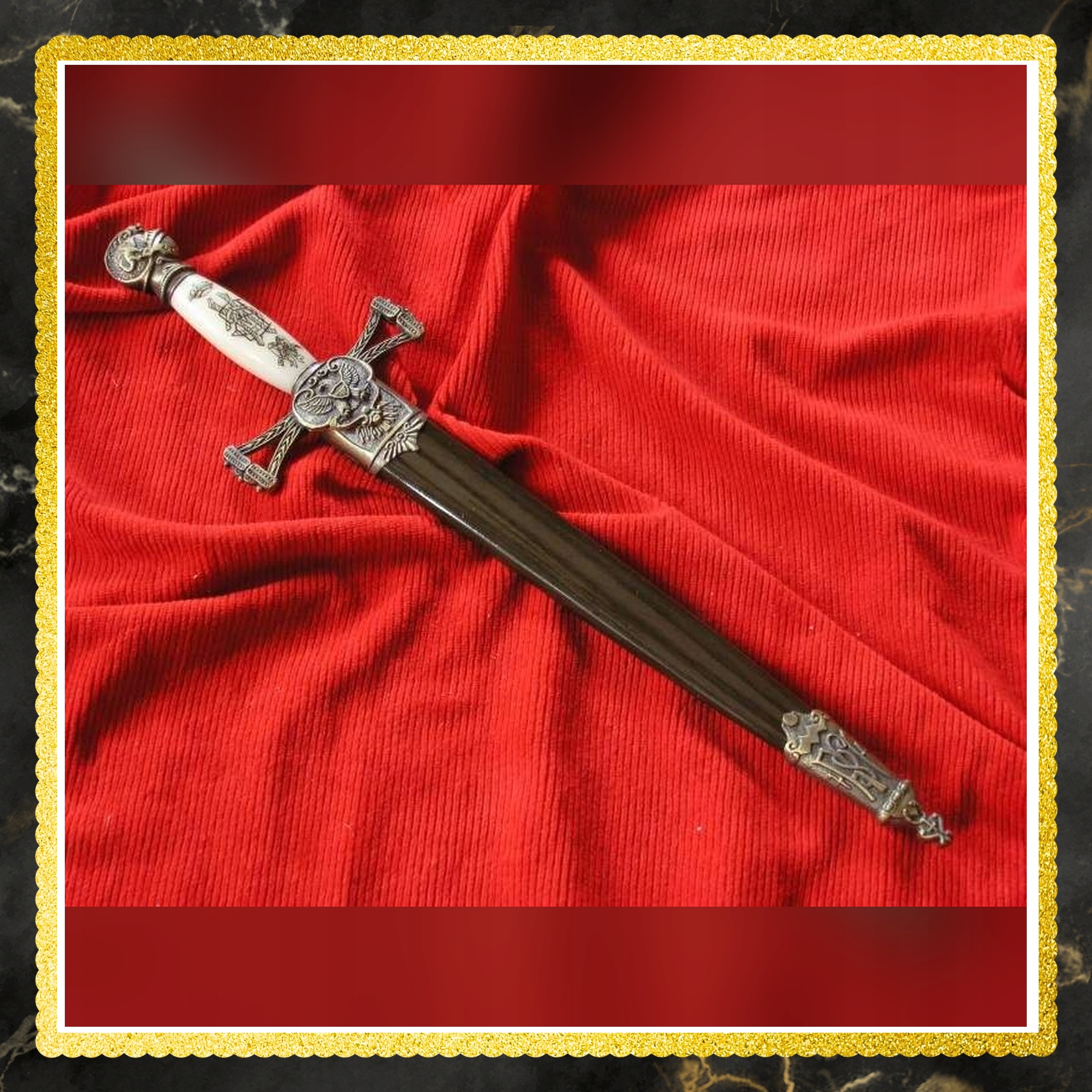 ❇an елемент цього кинджалу був зроблений з надзвичайною точністю та увагою до деталей. лезо з нержавіючої сталі гарантує довговічність та резистентність до корозії, зберігаючи при цьому справжній вигляд історичної зброї. Пластикова піхва не тільки захищає лезо, але й додає елегантного характеру. Ергономічна форма ручки забезпечує певне зчеплення, а ретельна обробка кожного елемента вказує на високу якісну майстерність. Цей кинджал - це не лише репліка, але й справжній твір ремісничого мистецтва.
