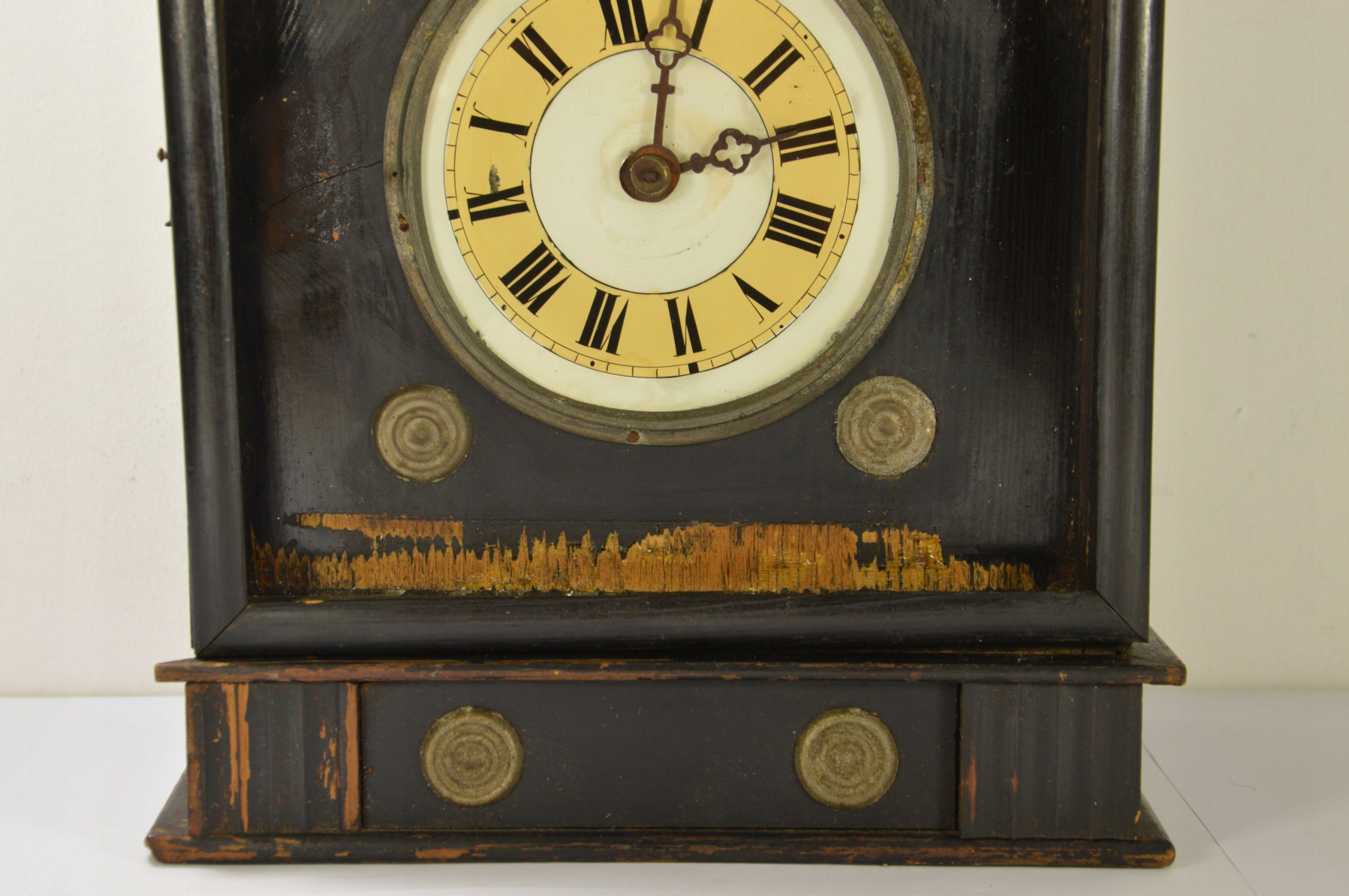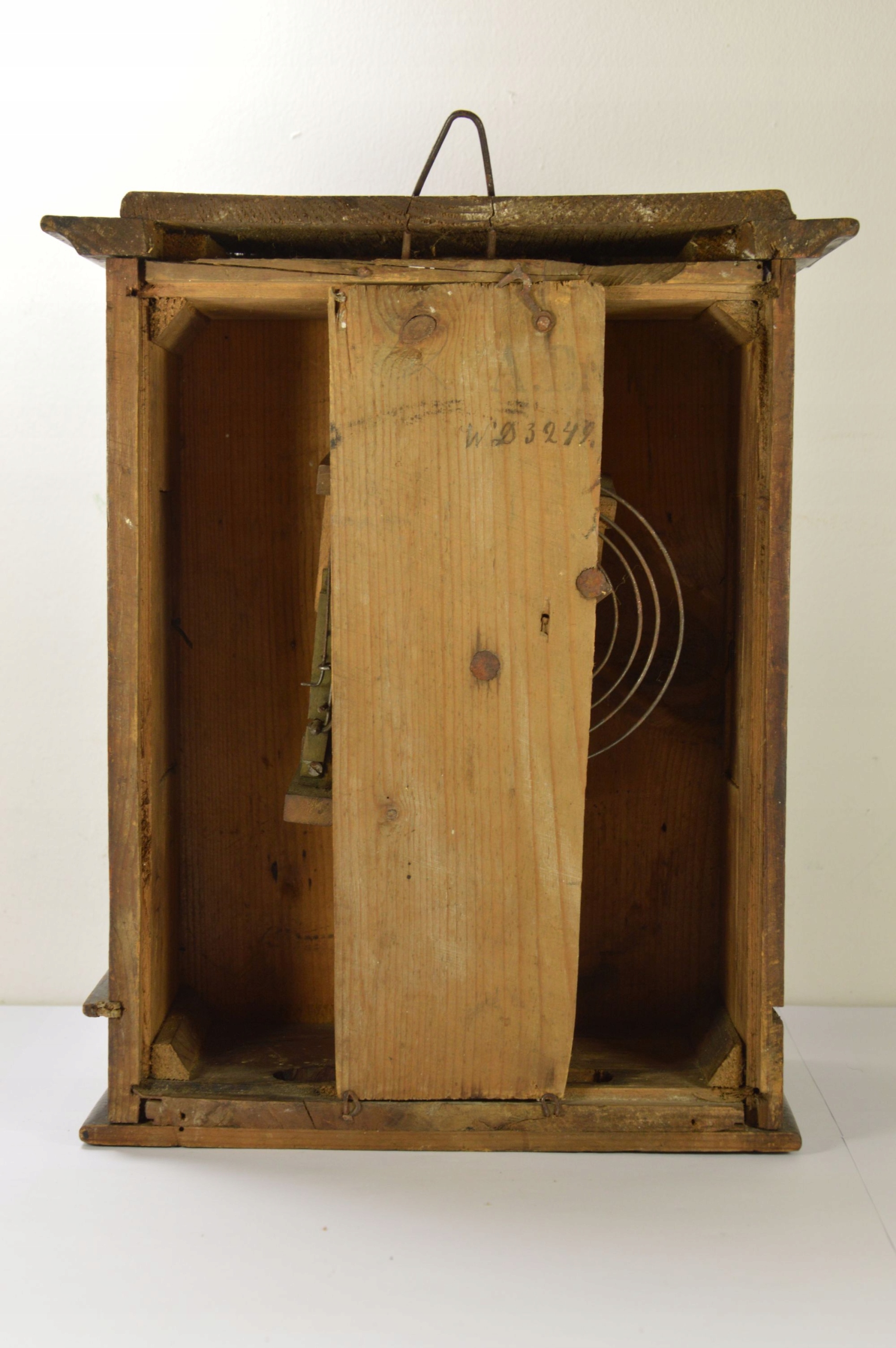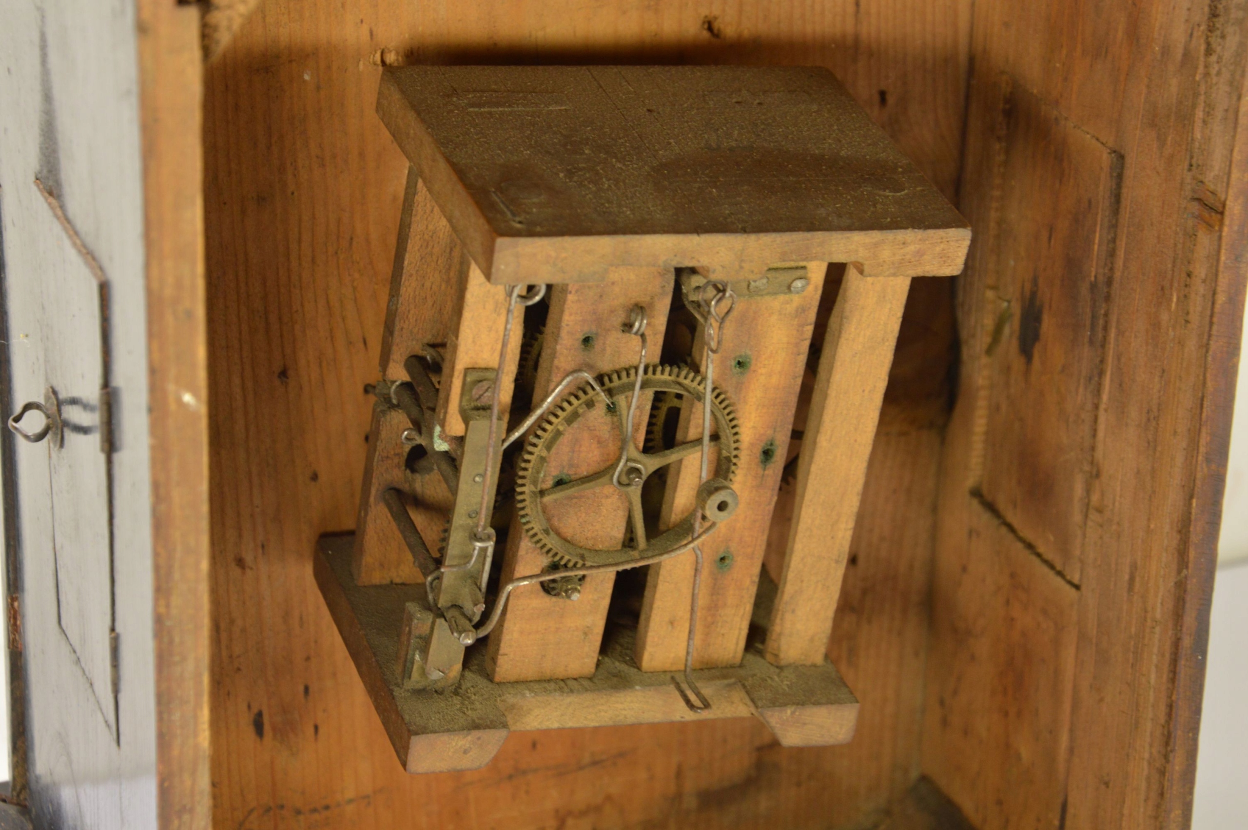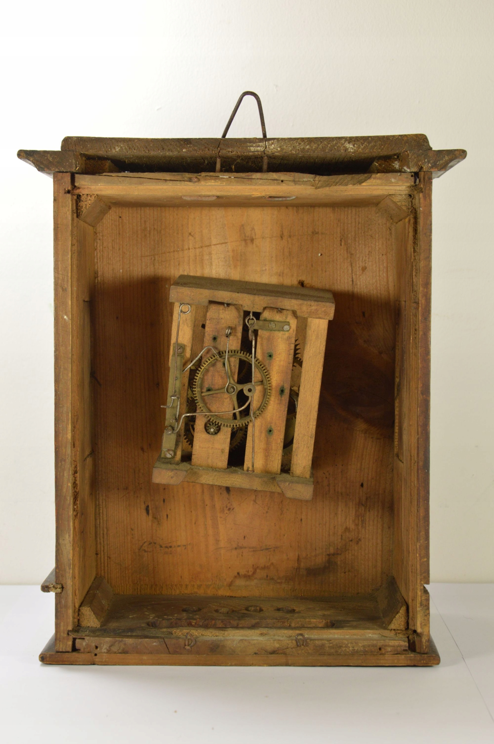 Цікавий старий дерев'яний годинник-ваги в дерев'яній коробці. Немає ваг або інформації про ефективність механізму, видимі пошкодження коробки, відсутні деталі.