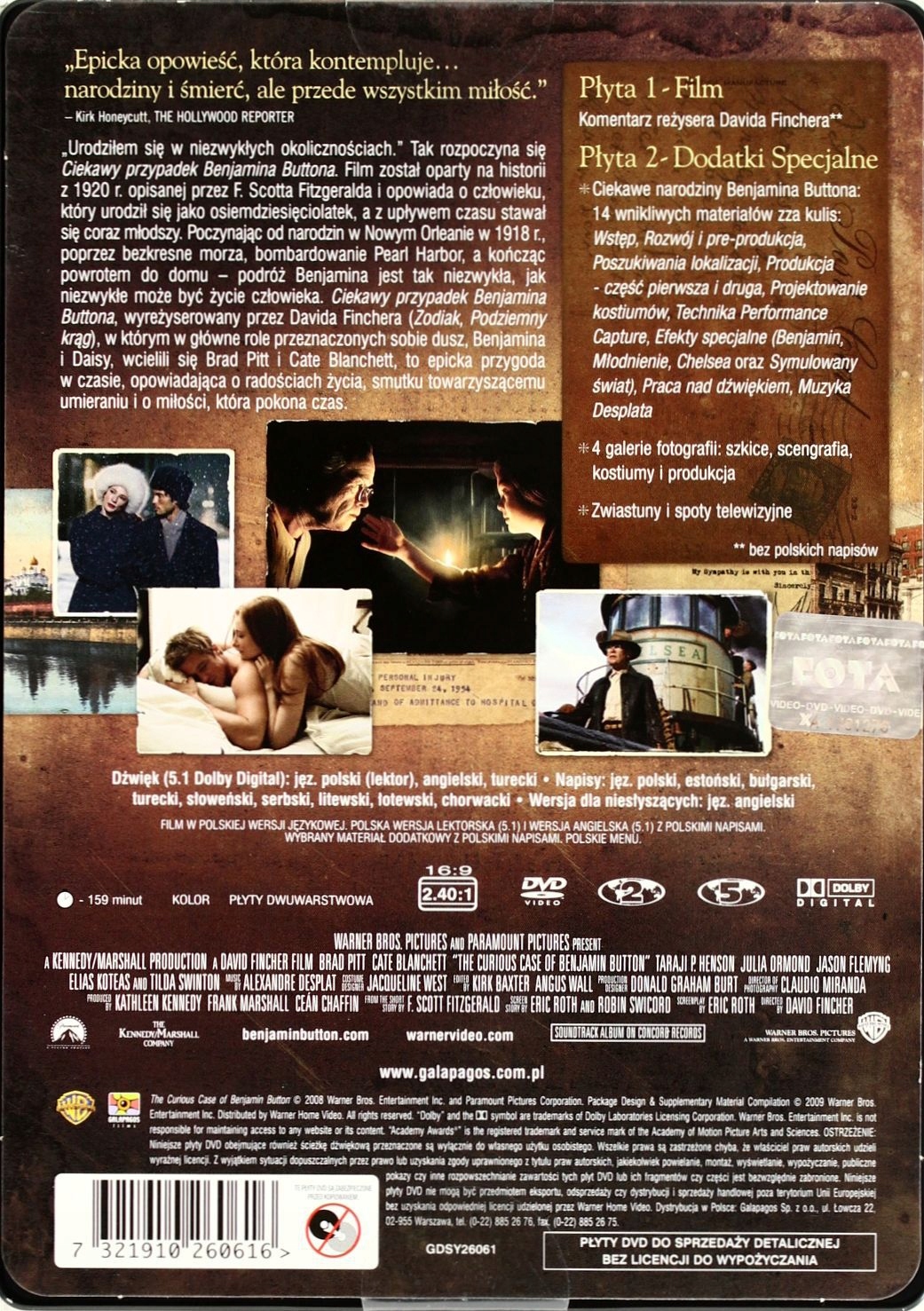 «Я народився в незвичайних обставинах». - так починається екранізація класичної новели Ф. Скотта Фіцджеральда 1920-х років про чоловіка, який народжується у вісімдесят і поступово молодшає. Про людину, яка, як і всі ми, не може зупинити плин часу. Спеціальне видання випущене в металевій упаковці!