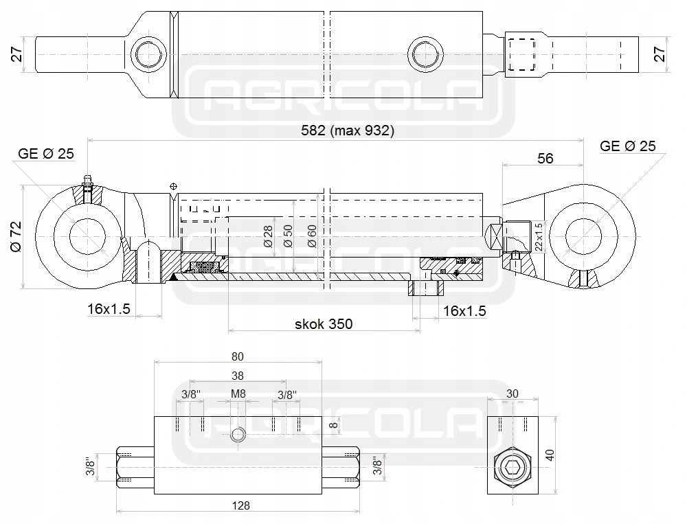 ЦИЛІНДР ГІДРОЦИЛІНДР 2-STR 50/28 ХОД 350 L582 + ЗАМОК ГІДРОЛІДЕРА