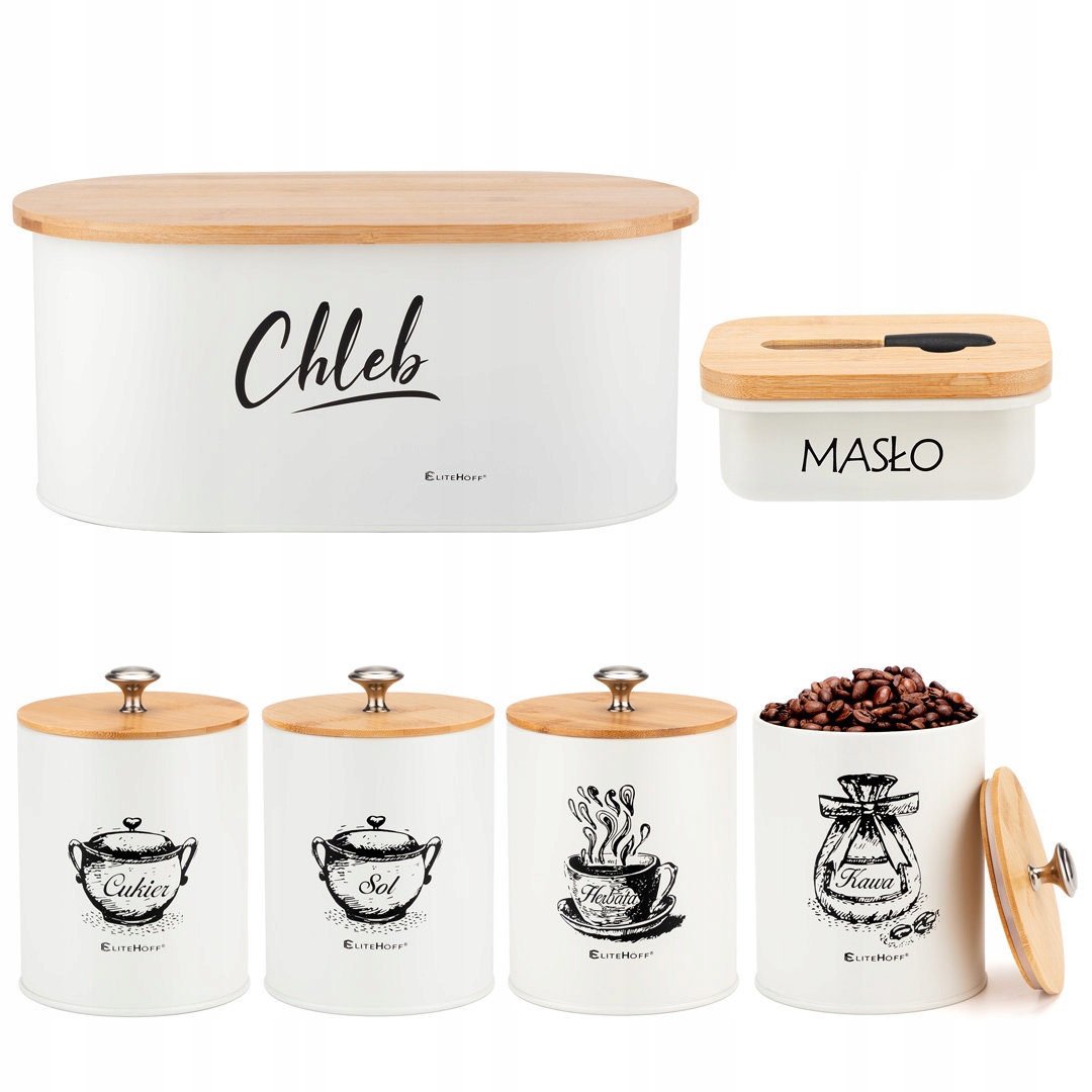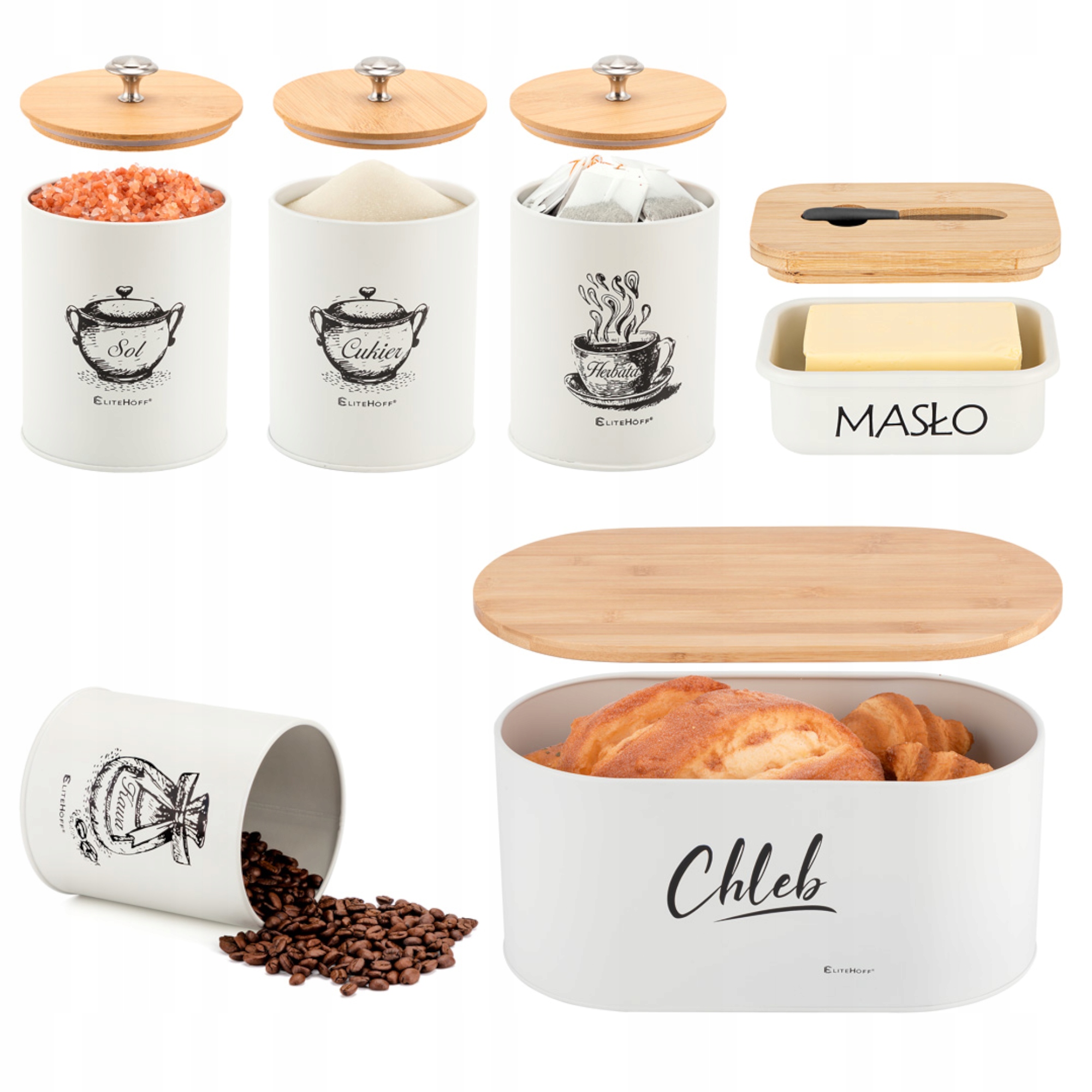 Кухонні ємності були розроблені, щоб задовольнити всі потреби вашої кухні. Вони стійкі до механічних пошкоджень і легко піддаються чистоті. Виготовлений з білого металу з порошковим покриттям. Чохли з бамбукового дерева. У кришці маслянки є ніж для масла, розміщений у профільованій ніші.