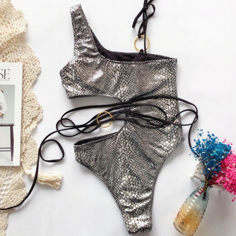 Металізований купальник зі зміїною шкірою має одну широку та одну тонку декоративну лямку з золотим кільцем. Бюстгальтер має жорсткі вставки всередині.