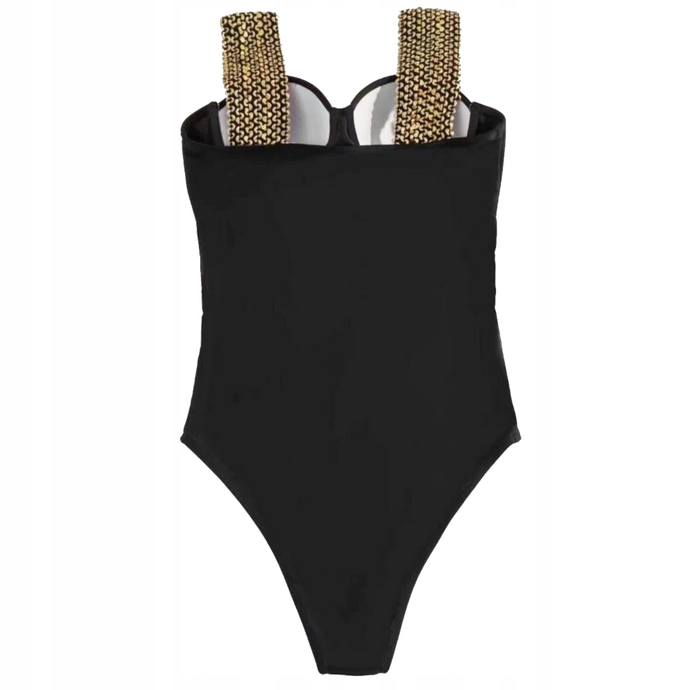 Костюм має жорсткі чашки та бюстгальтер-балконет, красиво відкриваючи бюст. Золоті бретельки надають костюму класності та елегантності.