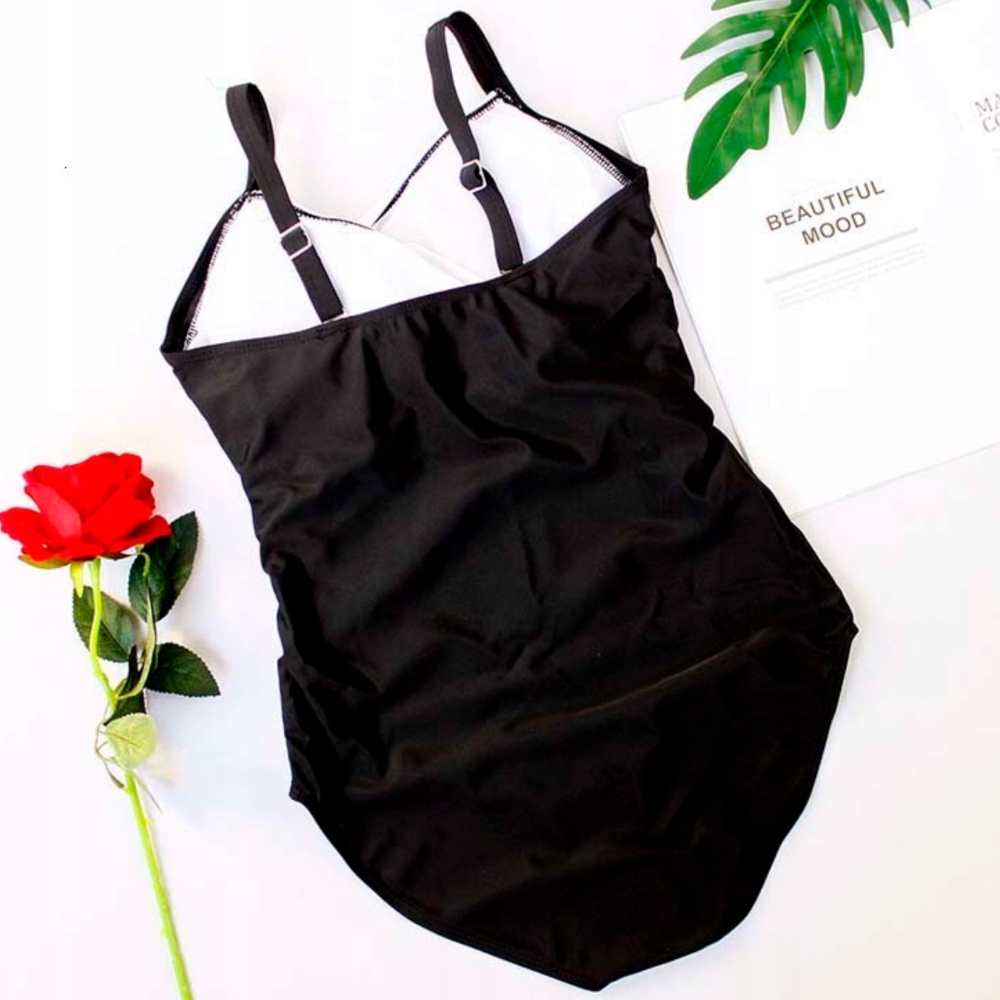 Костюм має малюнок, розміщений таким чином, щоб оптично формувати фігуру. Чорна внизу звужує живіт і талію, а зверху візерункова візуально збільшує бюст. Бретелі знімаються і зав'язуються на шиї.
