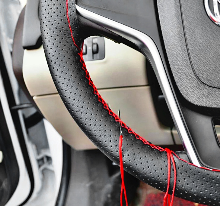 1. Помістіть чохол на кермо так, щоб шкіряний шарнір знаходився внизу та посередині керма. Чохол шиється від плеча до плеча, спочатку відміряйте відповідну довжину нитки, що входить в комплект. Вона приблизно вдвічі довша за ділянку, яку потрібно зшити, тобто від плеча до плеча.