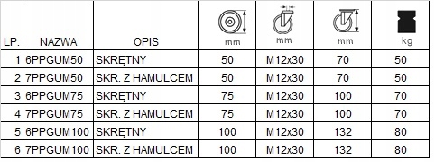 Набір із гальмом. Колесо складається з поліпропіленової втулки і гумової шини, що не залишає слідів, має підшипник ковзання, версія з чохлом. Монтаж набору з кодом M12x30 6PPGUM75. У таблиці під позицією 3.