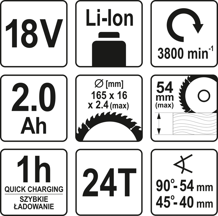 - Пила має батареї, подібні до інших пристроїв Yato Система 18 В (викрутки, ударні викрутки, кутова шліфувальна машина 125 мм, ударний гайковий ключ, шабельна пила, садові інструменти)