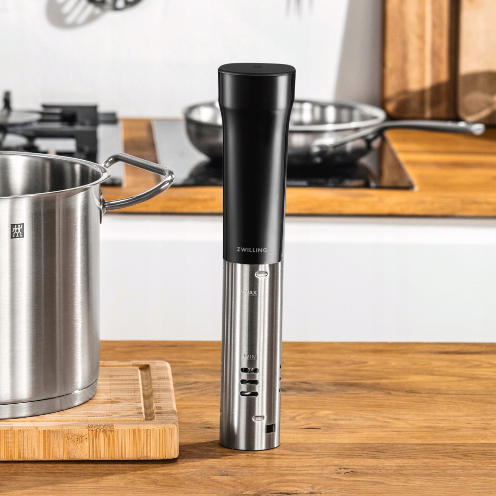 Зручний, компактний циркуляційний насос ZWILLING Enfinigy не тільки дає змогу контролювати температуру води та час приготування, але також дозволяє легко та інтуїтивно зрозуміло встановлювати їх за допомогою світлодіодного сенсорного дисплея. Завдяки шкалі 0,5 °C і точності ± 0,1 °C-0,2 °C в діапазоні 40-70 °C ви отримаєте надзвичайно точні налаштування. Поки ви готуєте смачні добавки, таймер зробить свою роботу і повідомить про це звуковим сигналом про закінчення роботи. Хочете поїсти трохи пізніше? Без проблем! Просто залиште їжу у воді - вона залишиться ідеально приготованою. І вуаля! Sous-vide у вашому мізинці!