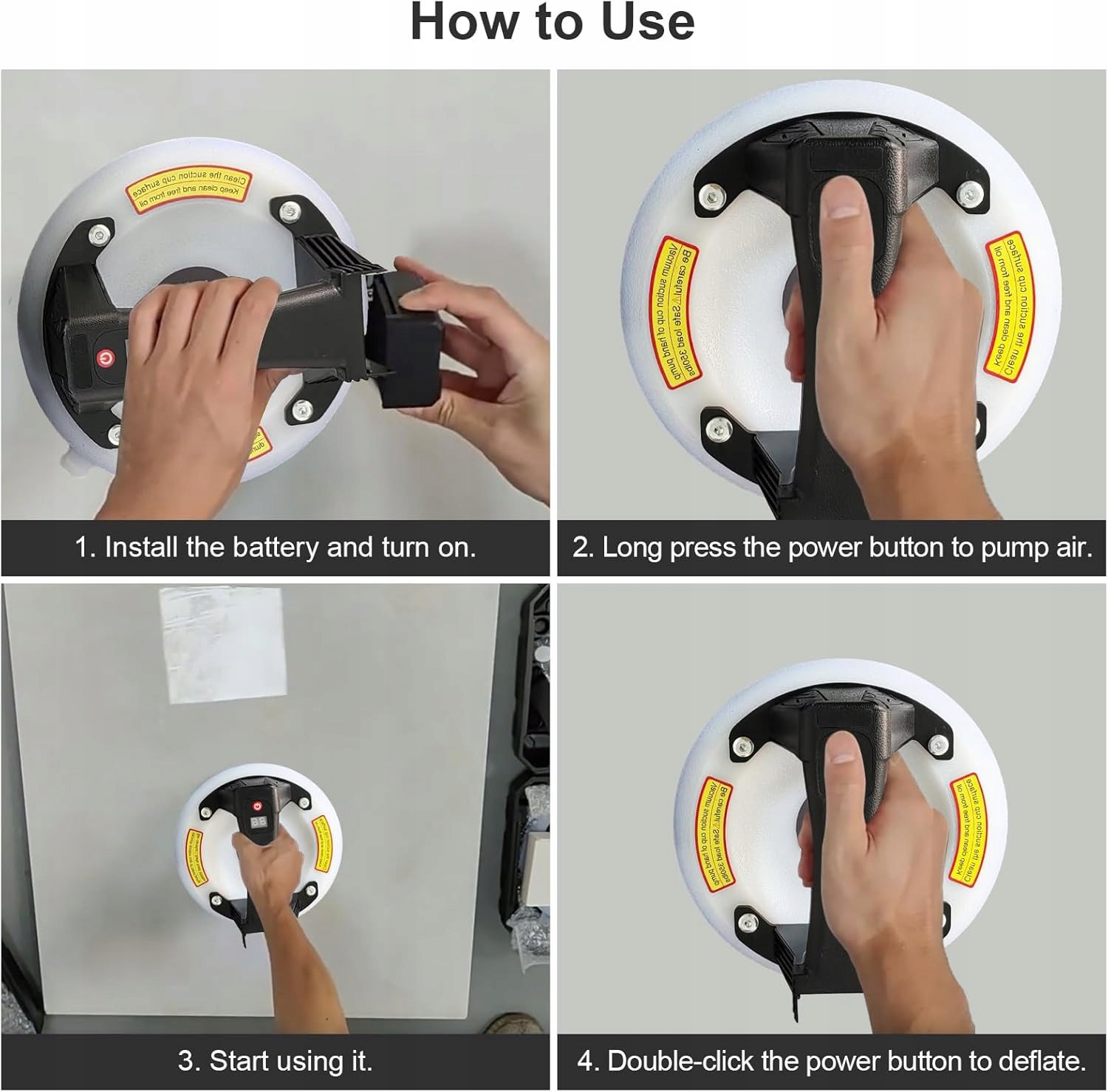 Автоматичне наповнення повітрям: цей електричний вакуумний підйомник може автоматично наповнювати повітрям, тому вам не доведеться турбуватися про витік повітря під час використання. Натисніть і утримуйте кнопку живлення, щоб накачати повітря, двічі клацніть кнопку живлення, щоб спустити повітря. Під час використання, якщо витік повітря становить менше 55 кПа, він автоматично поповнить повітря без ручного керування.