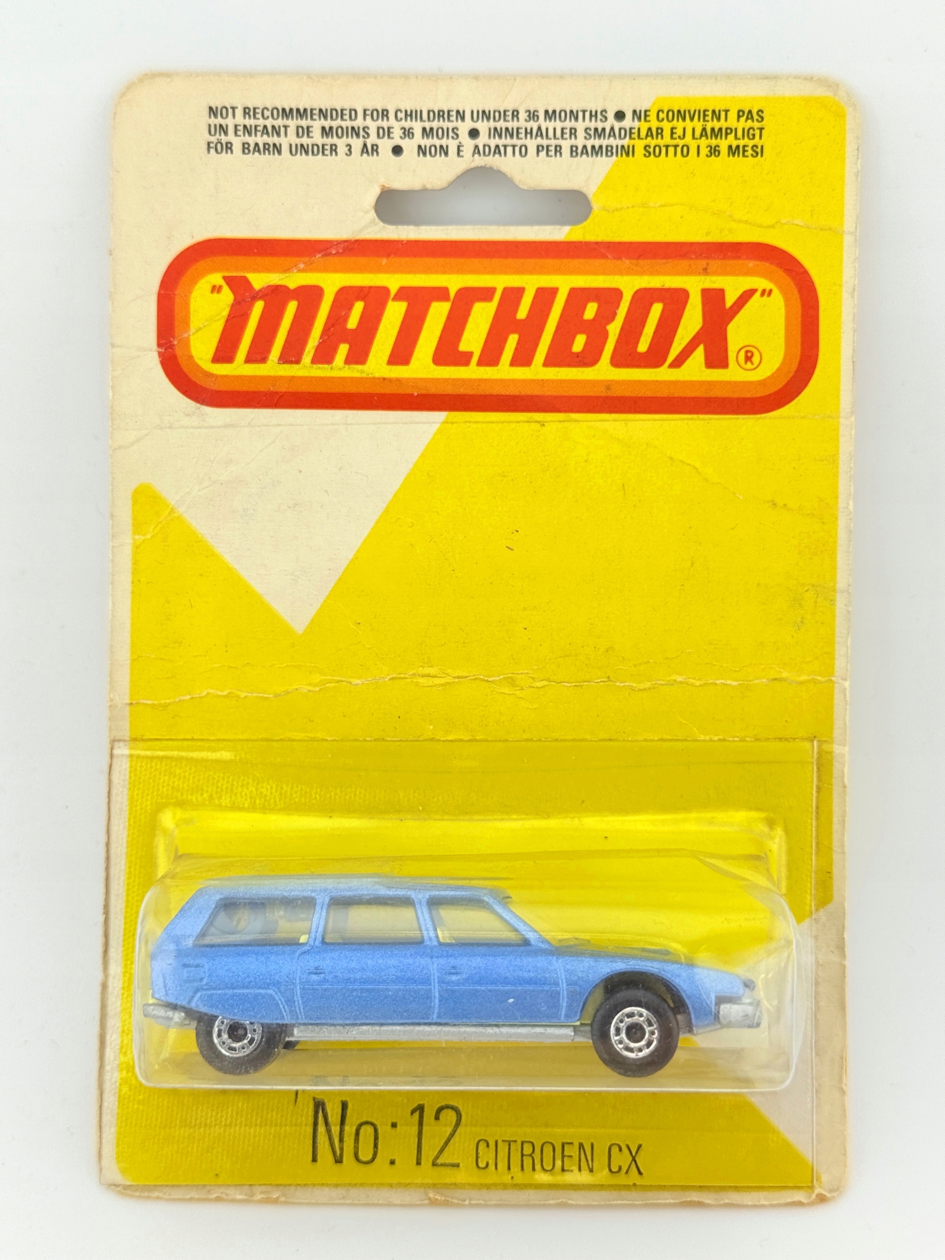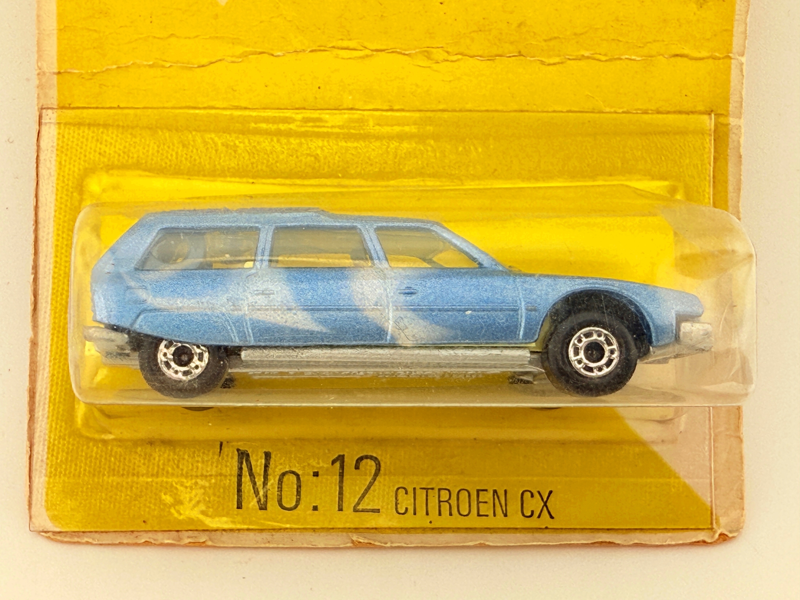 позначка: сірник • Модель: Citroen CX • Виробник: Lesney Products & Co. Ltd. • Масштаб: 1:64 • Умова: Використовується • Матеріал: метал+пластик • Довжина (мм): 70 мм (оцінюється) • Кольори: синій з білими візерунками • Аксесуари: оригінальна упаковка, деталі інтер’єру • Номер каталогу: №: 12 • Зроблено в: Англія