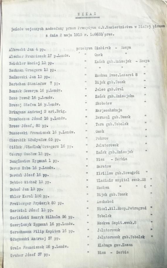 «Список військовополонених, надісланий Президією Цісарсько-Королівського Намісництва в Бялій листом від 2 травня. , 1915 L. 6633/през." .Текст машинописний, на 5 сторінках в алфавітному порядку подано прізвища в'язнів із зазначенням частини та місця перебування. Формат 21,1 х 33,7 см. Хороший стан, папір природно трохи пожовклий [ ПЕРША СВІТОВА ВІЙНА ][ C K ARMY ][ ВІЙСЬКОВІ ]183D