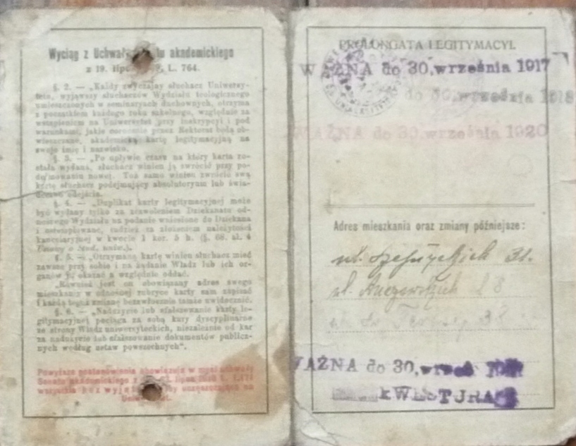 Ідентифікаційна картка видана C.K. університет ім Франциска І у Львові з датою 7 жовтня 1915 р. 4 сторінки, формат 7,5х11,5 см, стан середній ][ швидше за все без фото (сліди двох заклепок, що кріпили фото, склеювання, плями]