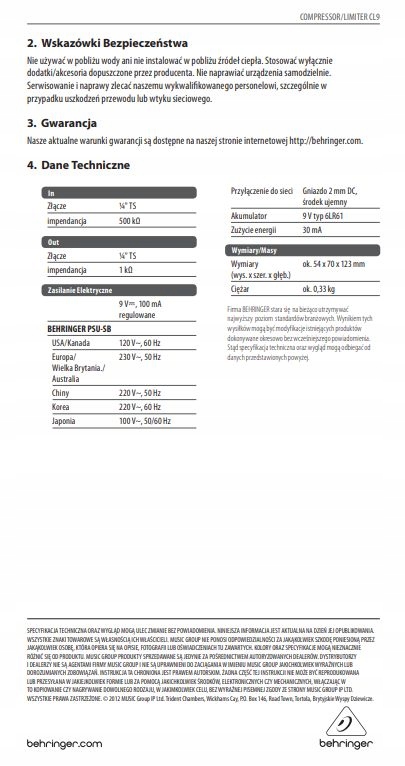 Просматривая «CL9 ограничитель компрессор Behringer Guitar Effect», вы можете быть уверены, что данный товар из каталога «[rubrica_name]» будет доставлен из Польши и проверен на целостность. В цене товара, указанной на сайте, учтена доставка из Польши. Внимание!!! Товары для Евросоюза, согласно законодательству стран Евросоюза, могут отличаться упаковкой или наполнением.