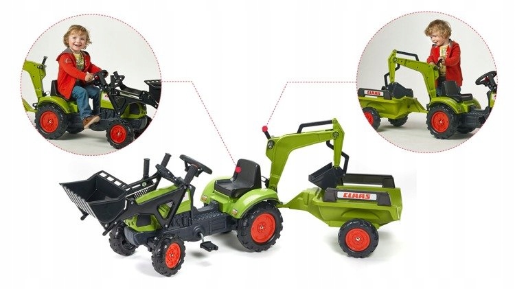 Новий дитячий педальний трактор CLAAS з ковшем, навантажувачем і причепом виготовлений з якісного пластику. Транспортний засіб призначений для дітей віком від 2 до 5 років. Ця модель сподобається кожному молодому трактористу, техніка виконана в оригінальних кольорах Claas.
