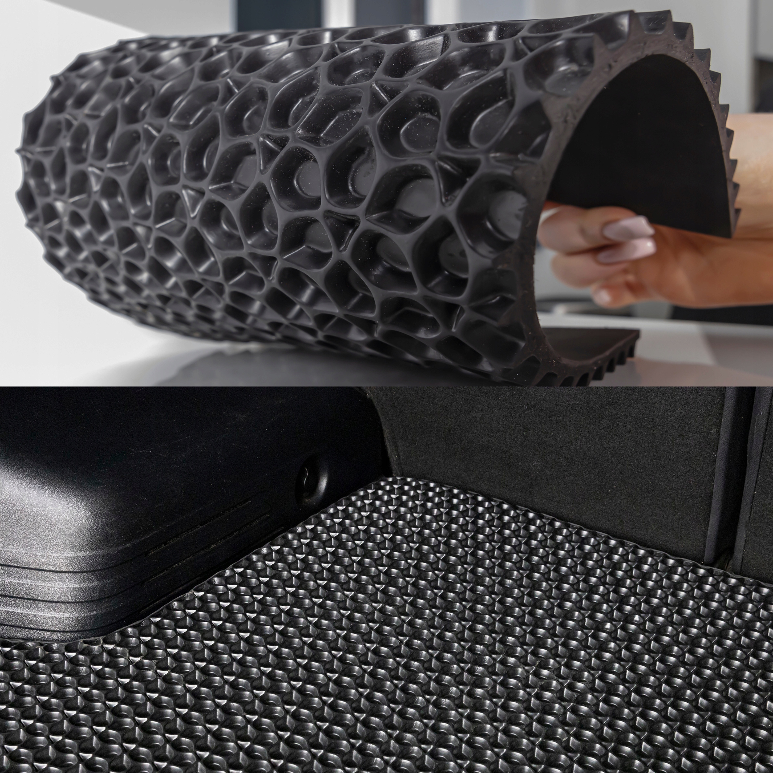 Матеріал EVA чорного кольору з глибокою структурою (крапелька води), що вбирає велику кількість бруду, безпечний і без запаху.