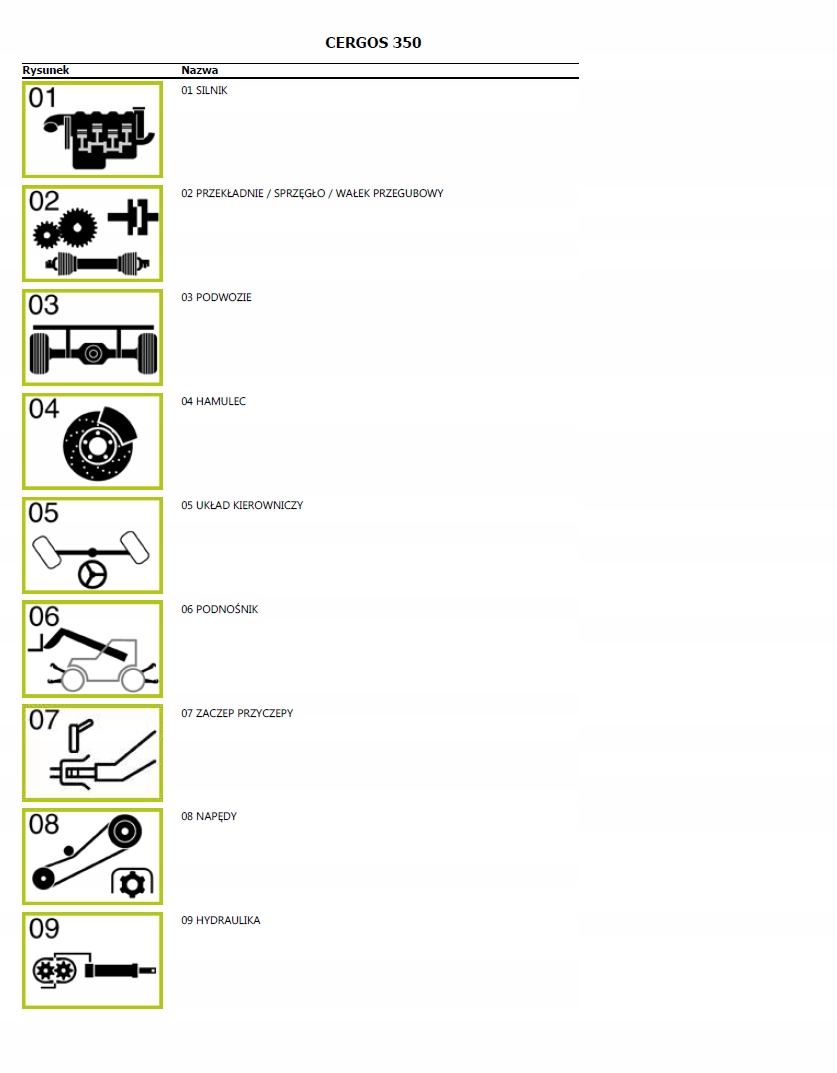 Я продаю каталог деталей для Claas Cergos 350 з поточними номерами каталогу, точними кресленнями та описами в польській мові. Він має до 1073 сторінок.