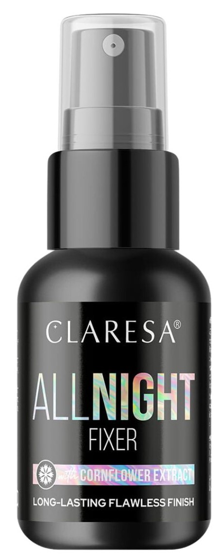 All Night Fixer від Claresa. Фіксуючий спрей. Ефективно продовжує стійкість макіяжу. Це гарантує, що косметика залишається незмінною протягом довгих годин. Має легку консистенцію і зручну упаковку з розпилювачем, що дозволяє рівномірно розпорошити засіб на шкіру. Він збагачений екстрактом волошки та пантенолом із сильними зволожуючими, заспокійливими та заспокійливими властивостями. Косметичний засіб випускається в ємності 50 мл.
