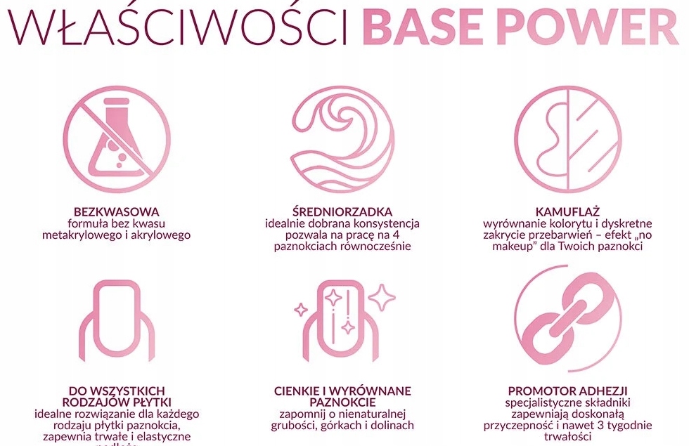 Унікальна середньорідка консистенція основи дозволяє легко, тонко та швидко наносити, тому ви можете нафарбувати 4 нігті одночасно (крім великих пальців). Ми підібрали формулу таким чином, що основа практично розподіляється сама - засіб швидко розрівнюється і вам не доведеться турбуватися про розгладжування смуг пензлем, адже вони зникають в мить ока. Ми збагатили базу даних спеціальним компонентом, т. зв підсилювач адгезії, який забезпечує високу адгезію, довговічність до 3 тижнів і стійкість до відколів і утворення повітря.