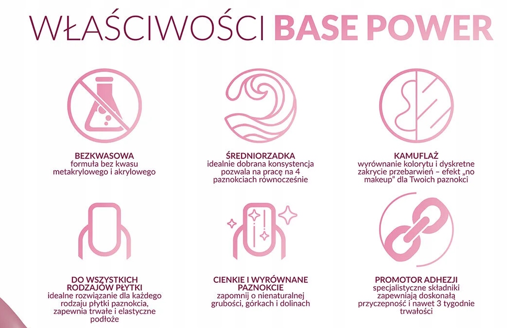 Унікальна середньорідка консистенція основи дозволяє легко, тонко та швидко наносити, тому ви можете нафарбувати 4 нігті одночасно (крім великих пальців). Ми підібрали формулу таким чином, що основа практично розподіляється сама - засіб швидко розрівнюється і вам не доведеться турбуватися про розгладжування смуг пензлем, адже вони зникають в мить ока. Ми збагатили базу даних спеціальним компонентом, т. зв підсилювач адгезії, який забезпечує високу адгезію, довговічність до 3 тижнів і стійкість до відколів і утворення повітря.